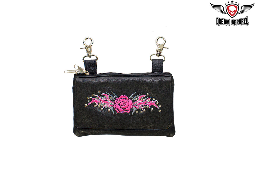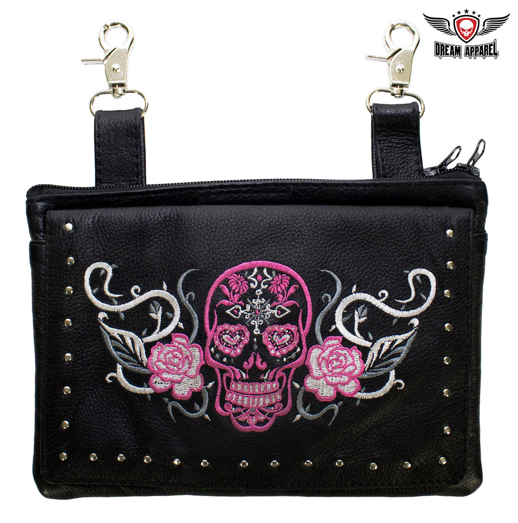 Pink & White Sugar Skull Naked Cowhide Leather Gun Holster Belt Bag with Studs