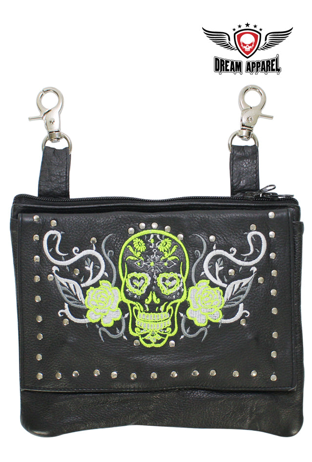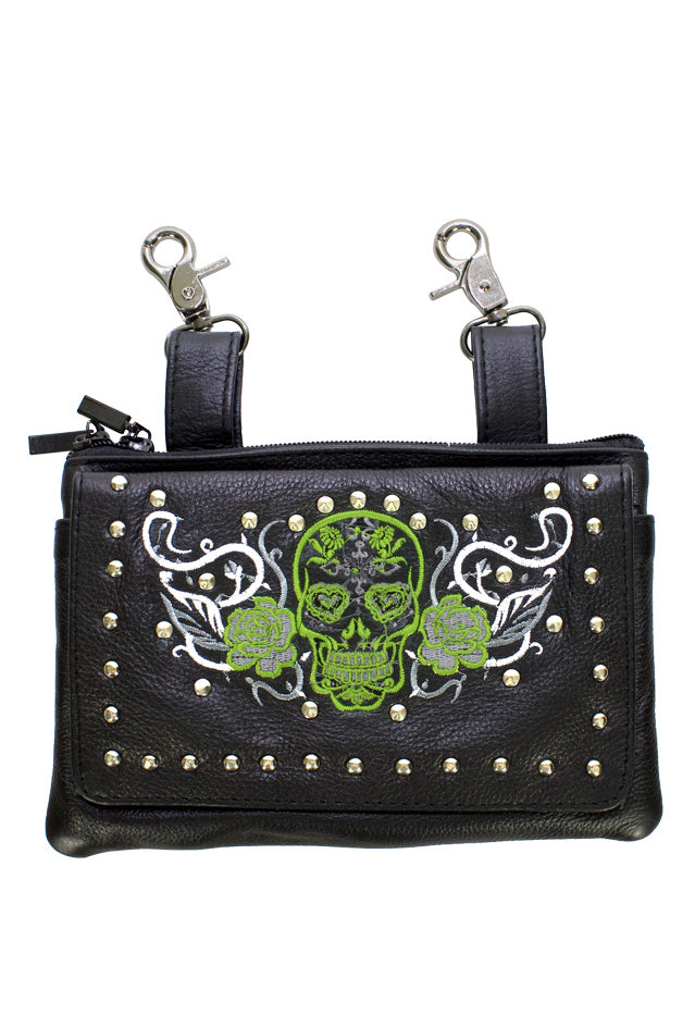 Studded Lime Green & White Sugar Skull Naked Cowhide Leather Belt Bag W/ Gun Pocket