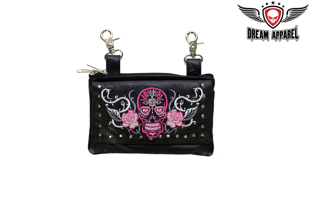 Studded Hot Pink Sugar Skull Naked Cowhide Leather Belt Bag