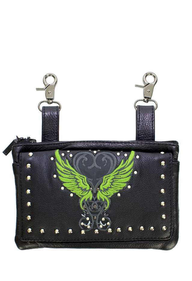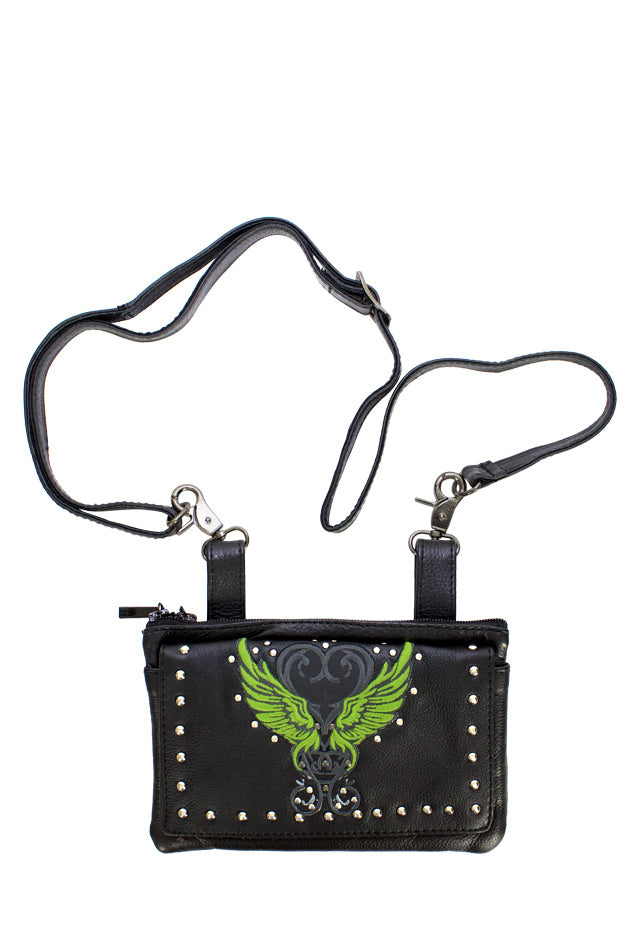 Studded Naked Cowhide Leather Belt Bag With Lime Green Wings