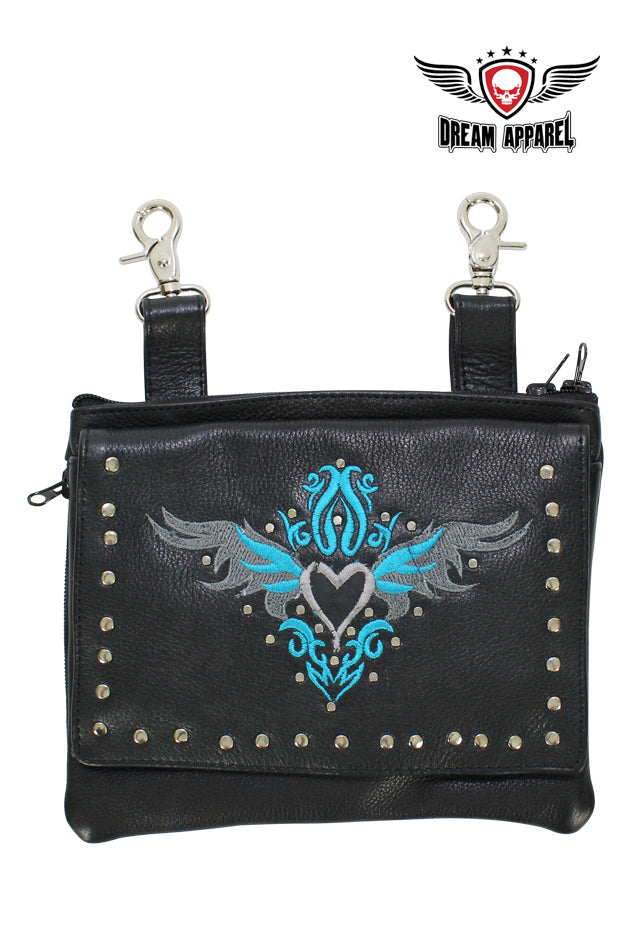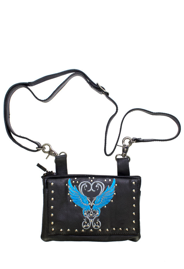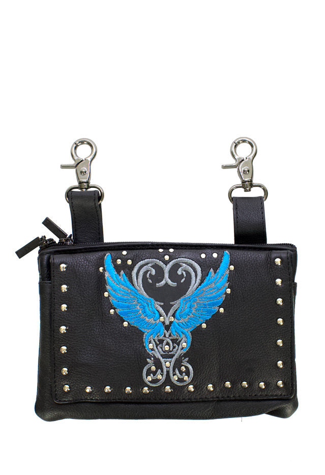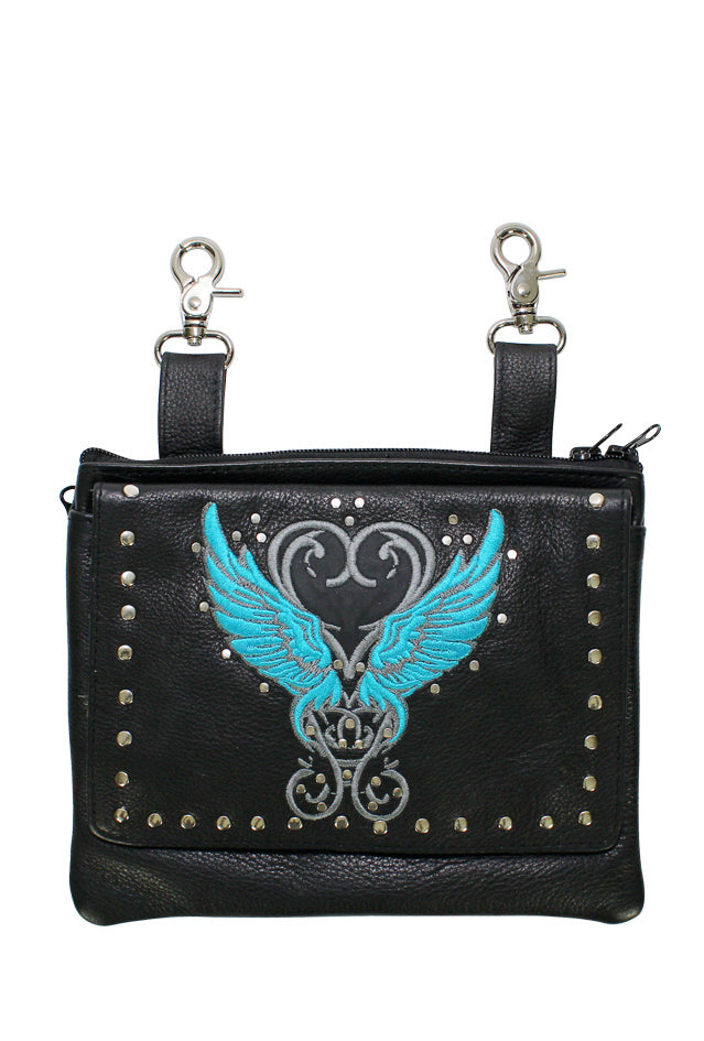 Studded Naked Cowhide Leather Belt Bag with Teal Wings