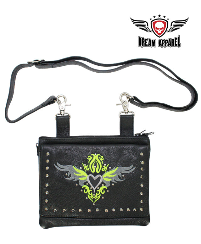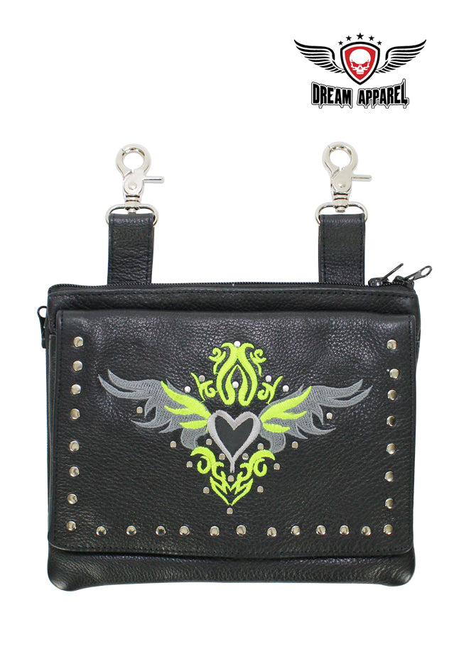 Studded Naked Cowhide Leather Belt Bag with Lime Green/Gray Heart