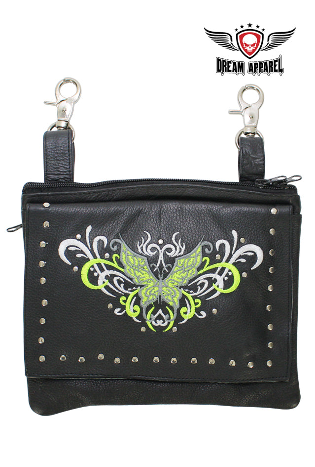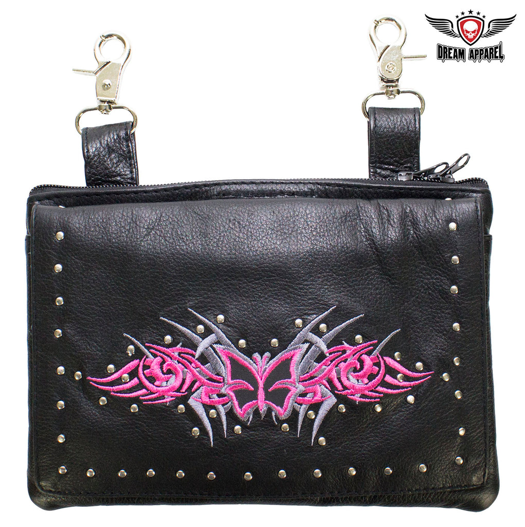 Studded Naked Cowhide Leather Gun Holster Belt Bag with Pink & Silver Butterfly