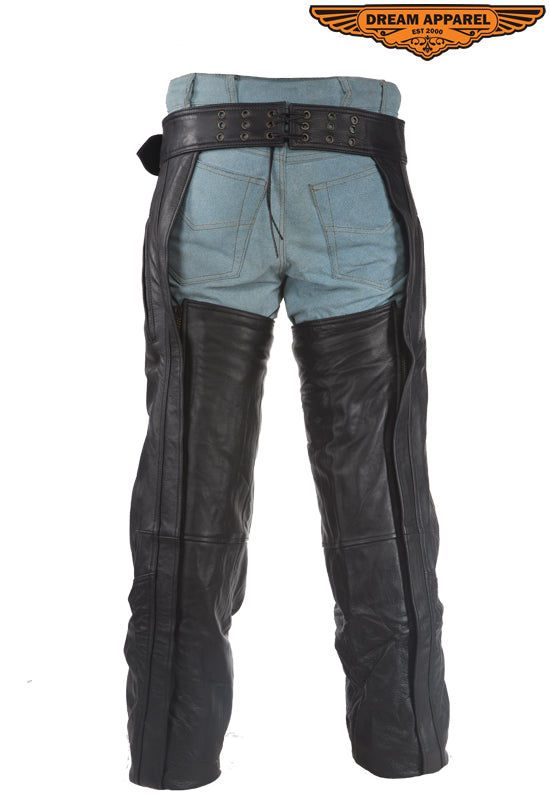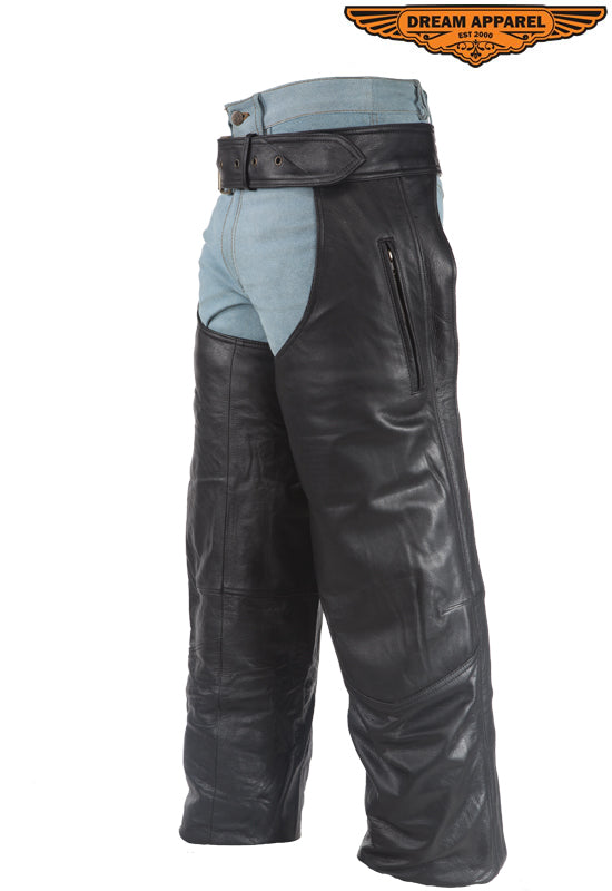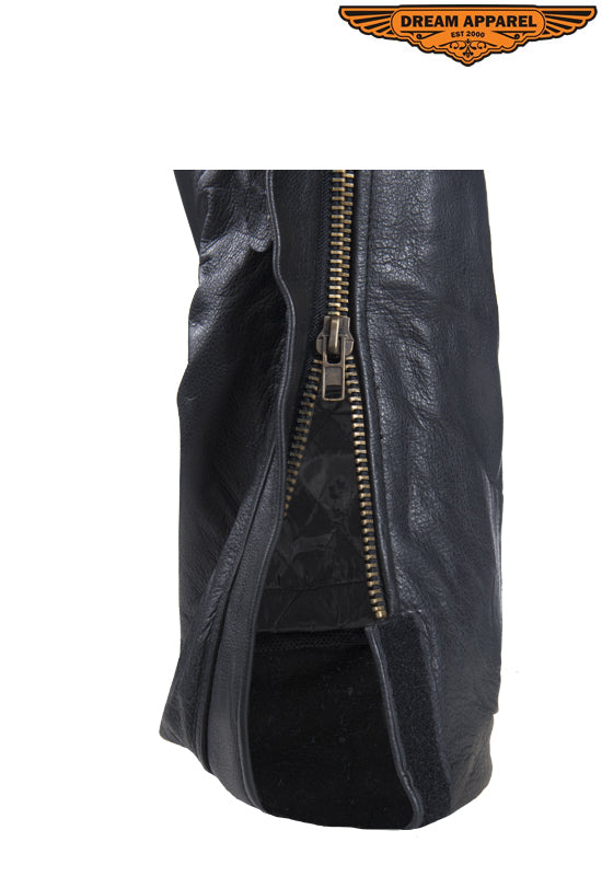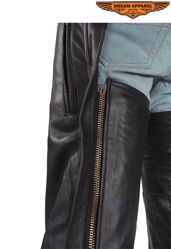 Heavy duty but very soft touch are these leather cowhide chaps. A leather zipper runs along the side of the pants until it reachers that snaps at the bottom with flaps that hides the zipper.
