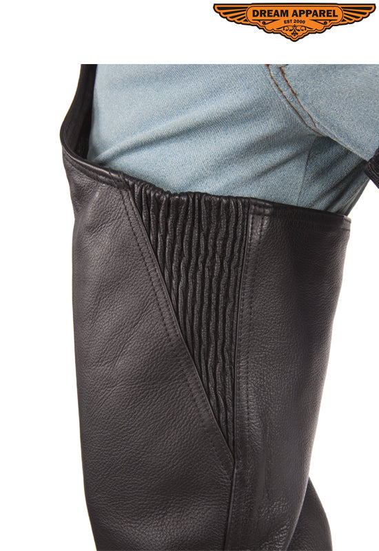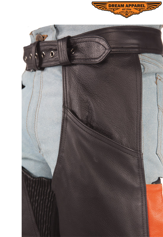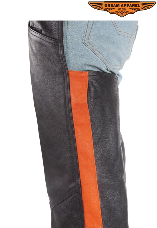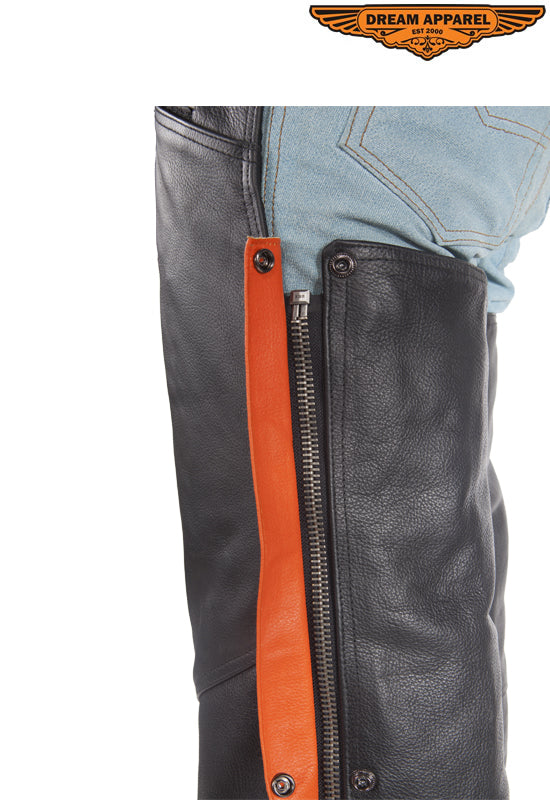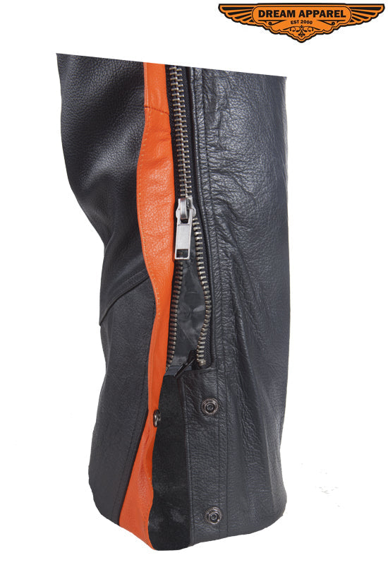 These orange stripe chaps are heavy duty top grade leather that also has a soft touch to give it a great feel. Chaps also have a zipper that goes down to the bottom with a flap that hides the mesh lining and zipper.