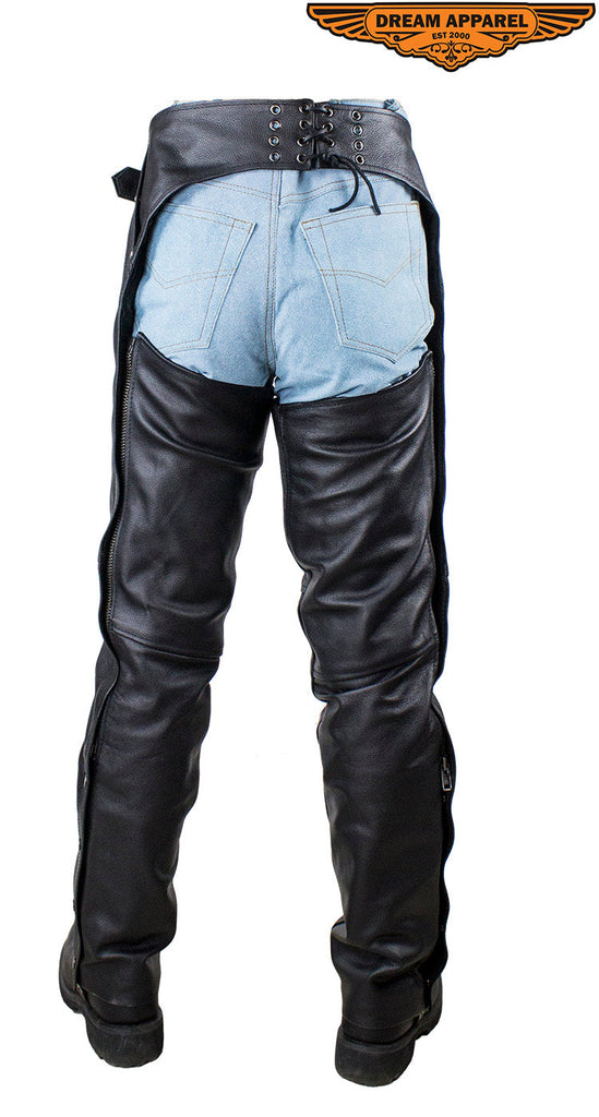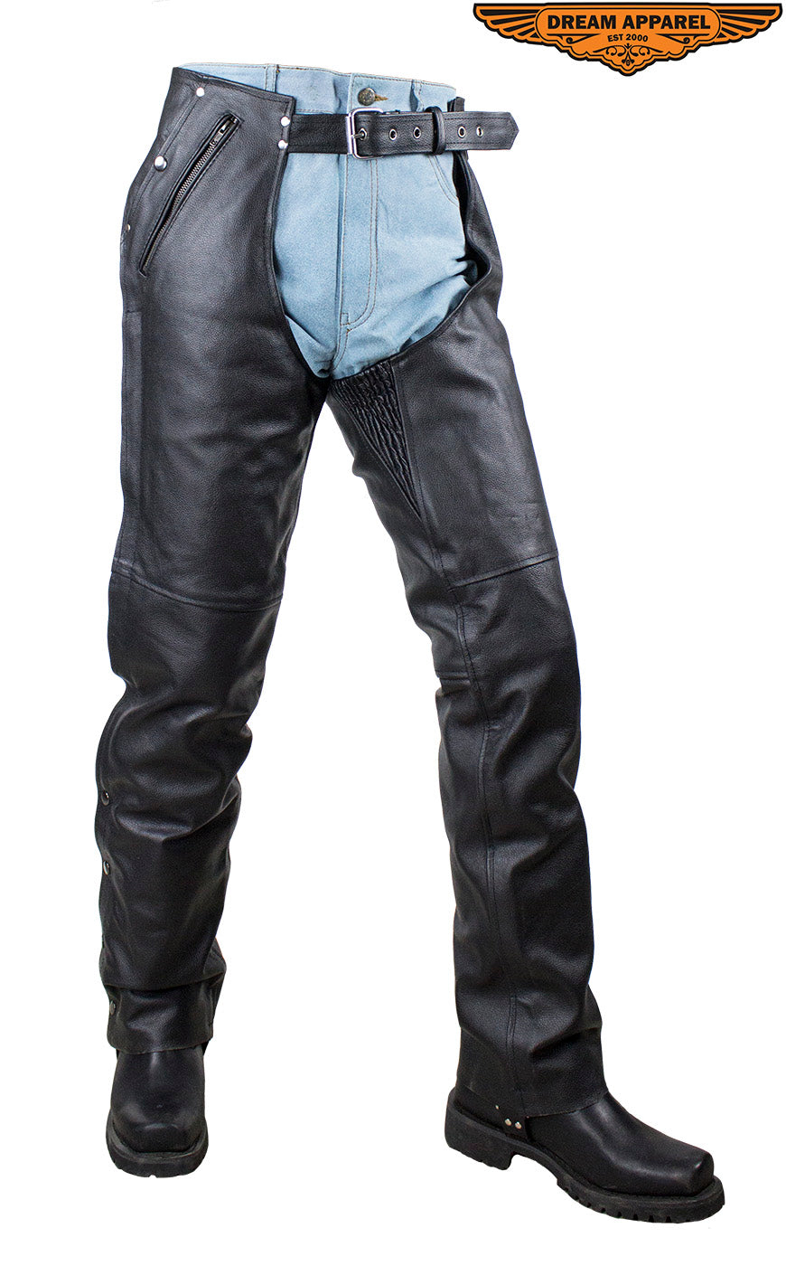 You cannot go wrong with a great pair of chaps and here at Dream Apparel, we provide the best. Introducing our beautiful new black multi-pocket cowhide leather chaps. These chaps include a total of four pockets, two of which are zippered and the other two are snapped. The pockets each supply a decent amount of added storage. Along with this, it features mesh and zipout lining. The leather is heavy duty top grade but also with a soft touch. There is a zipper that runs long the side of the pants until it reaches the snaps at the bottom that has a flap that hides the zipper. The chaps help you ride comfortably by providing the biker with grip while protecting from sweat and