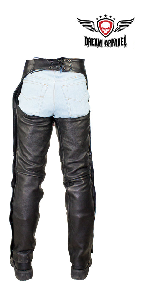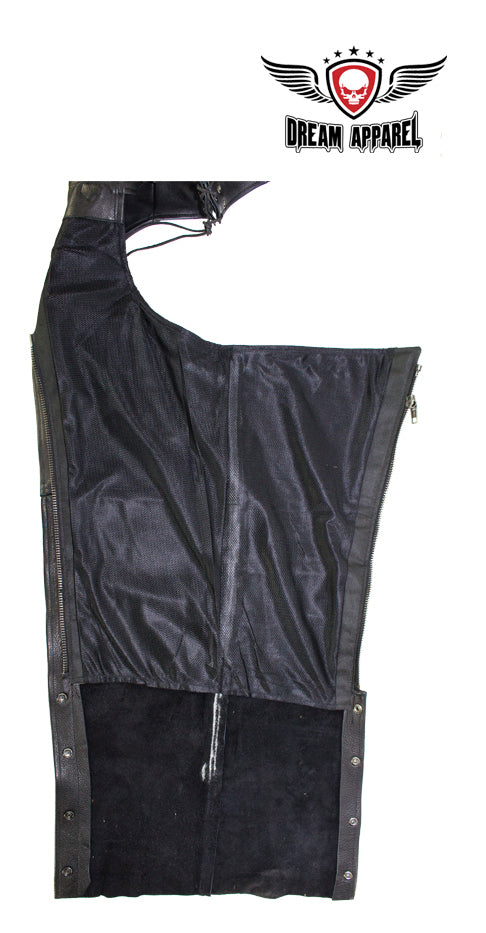 Nothing like a great pair of chaps, as every biker already knows. These black naked cowhide leather chaps feature mesh lining, two pockets, and zippers that run along each side until the snaps are reached. These chaps are made with a beautiful naked