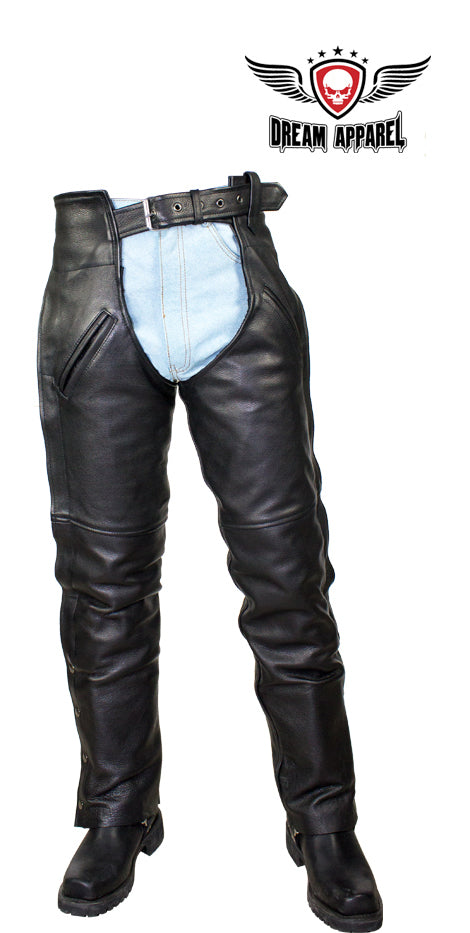 Nothing like a great pair of chaps, as every biker already knows. These black split cowhide leather chaps feature mesh lining, two pockets, and zippers that run along each side until the snaps are reached. These chaps are made with a beautiful split cowhide leather sure to make you standout. Gathered fit makes for the best most comfortable fit possible. All bikers can benefit with a pair of these.