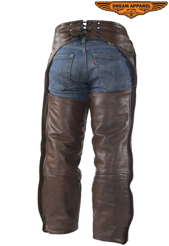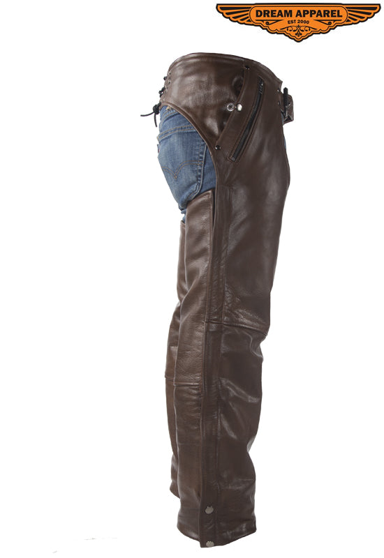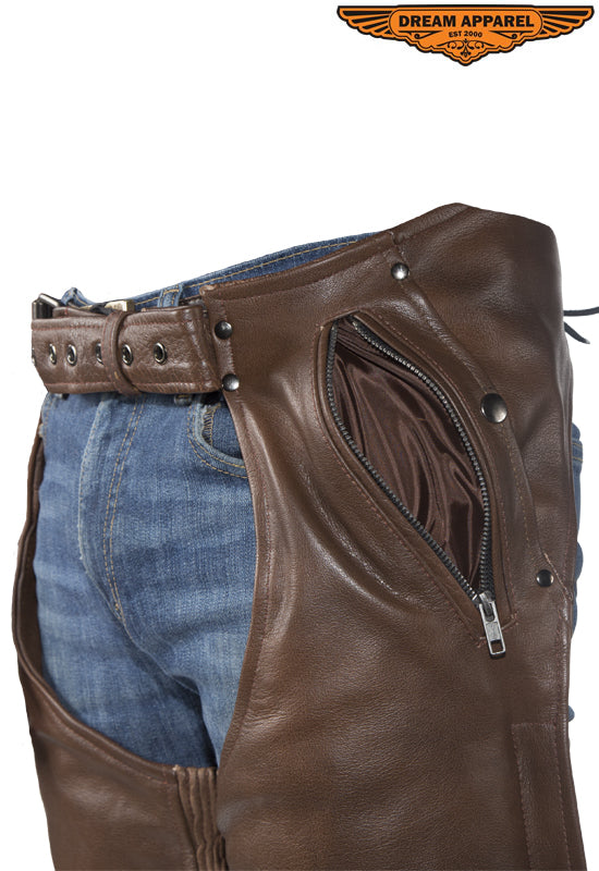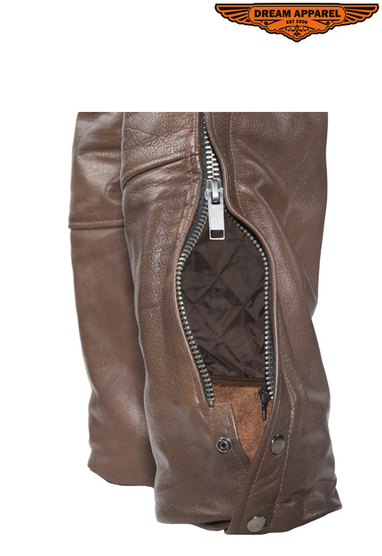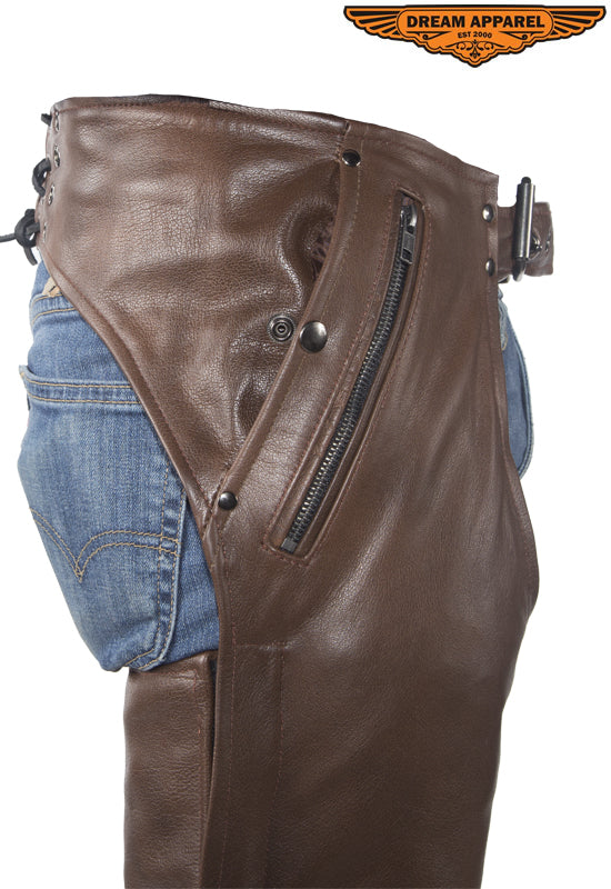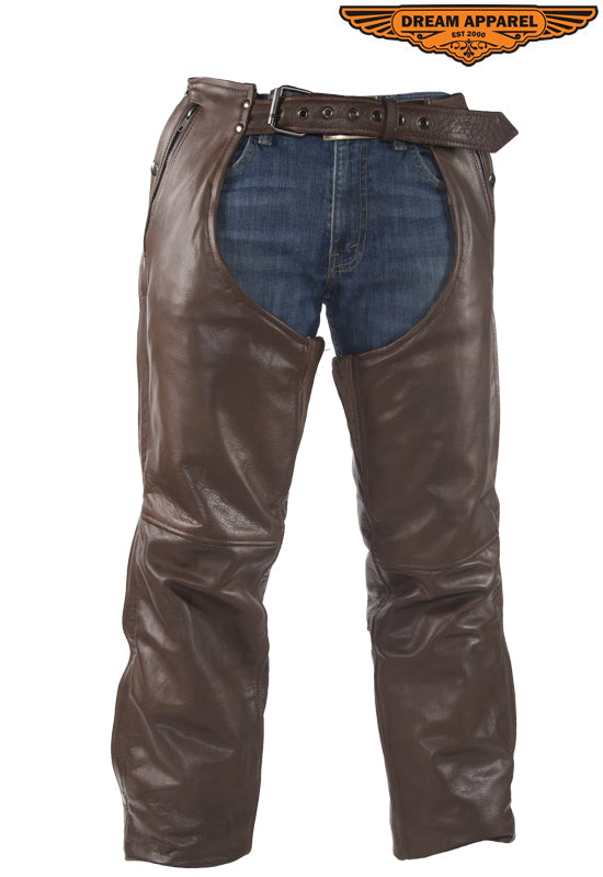 Brown leather chaps are considered a need by the bikers, but yet there are some of us that don't wear any protection at all. But going back to those that wear protection this pair of leather chaps features 3 pockets, gathered fitting and mesh lining.