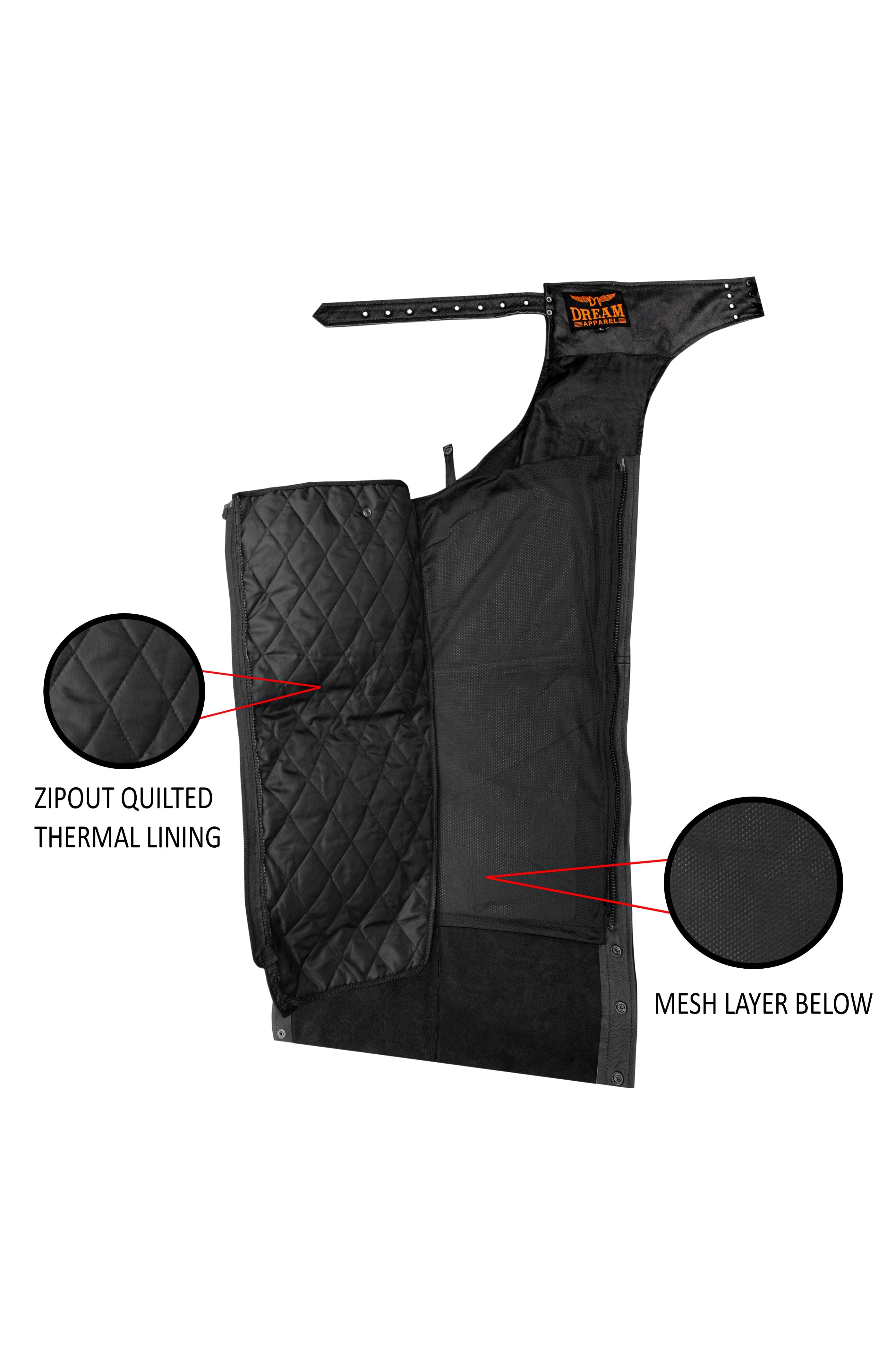 Dream Apparel Black Multi-Pocket Premium Cowhide Leather Chaps Removable Lining - 3XL is backordered and will ship as soon as it is back in stock.