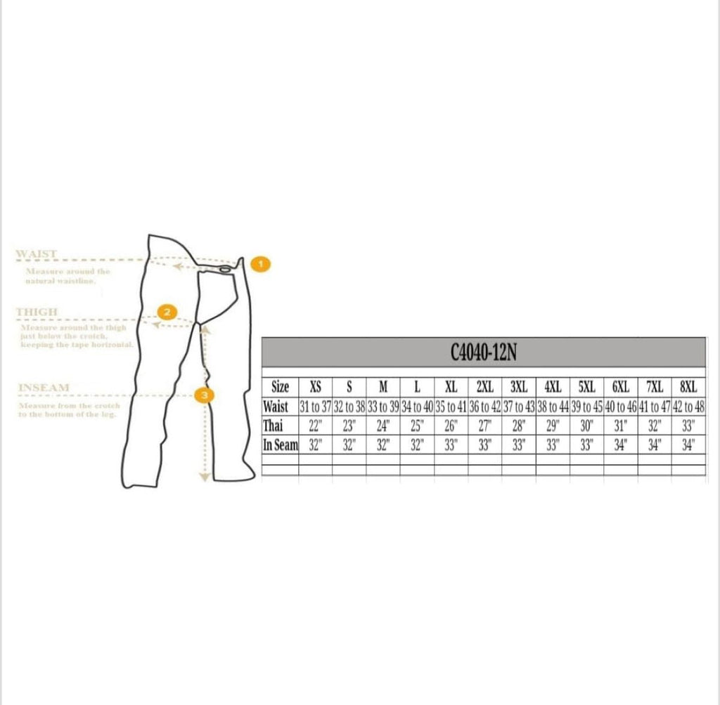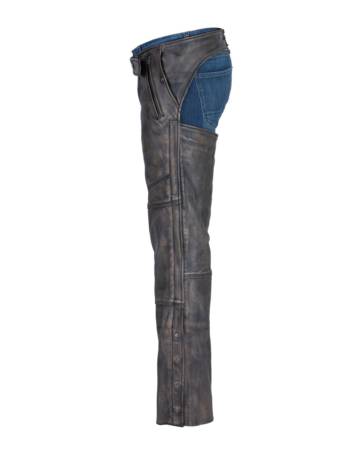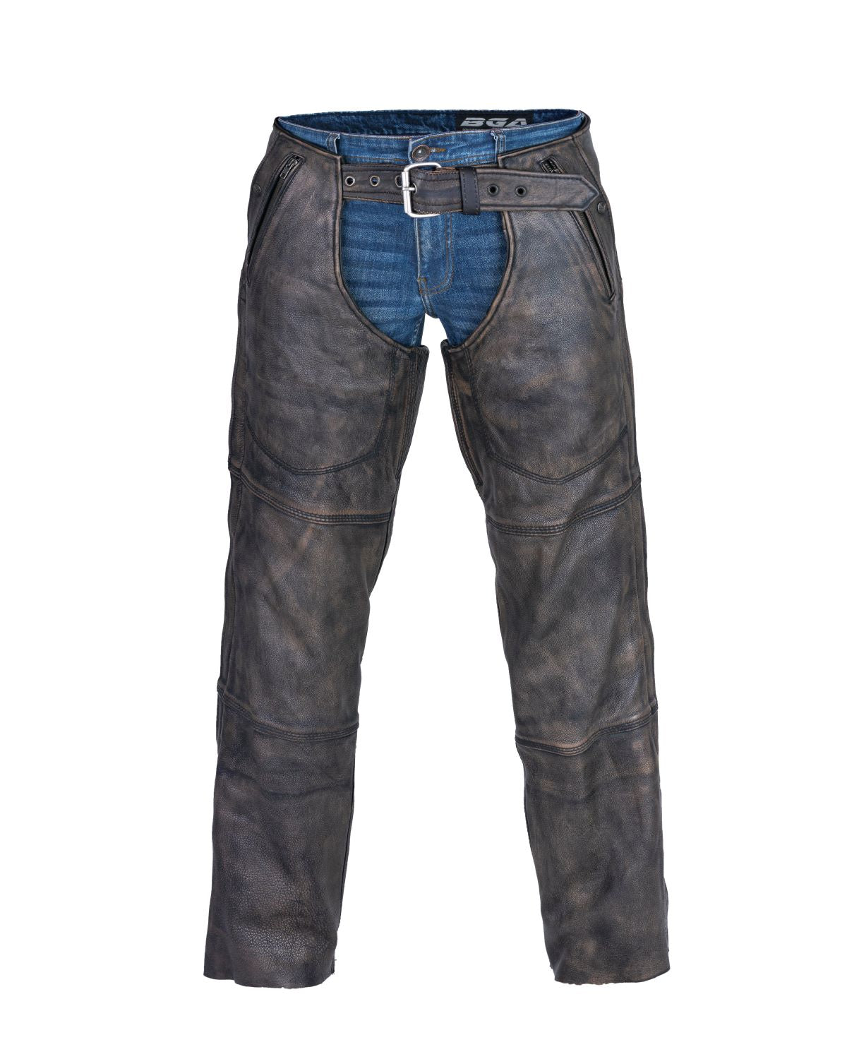 This brown leather heavy duty chaps has 4 pockets, 2 on each leg. There is a zippered pocket to keep your items secured and a snapped pocket as well. Enjoy riding your bike with this chap that will protect you from water, wind and bugs!