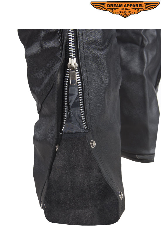 Heavy duty top grade leather braided chaps also have a soft touch to give it a great feel. Chaps also have 2 pockets and zippers that reaches the snaps at the bottom with a flap that covers the lining and zipper.
