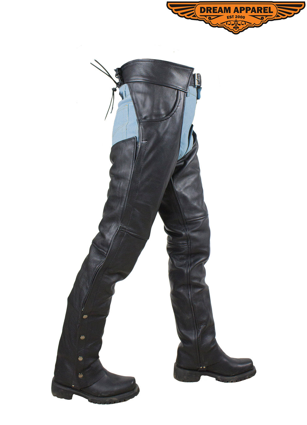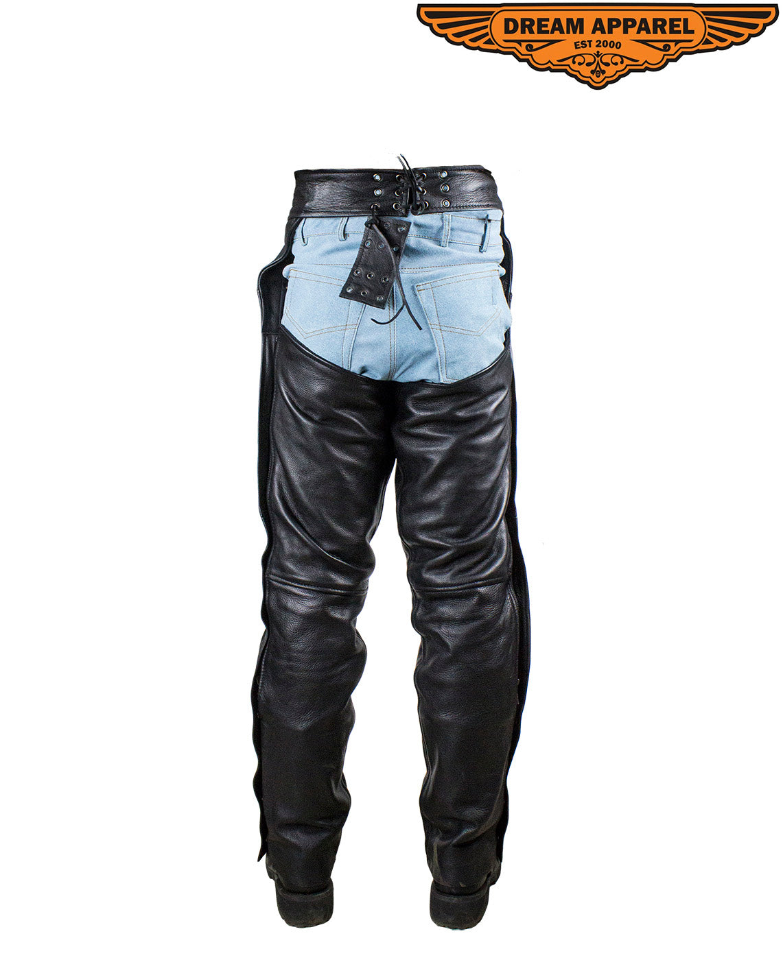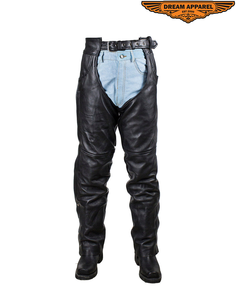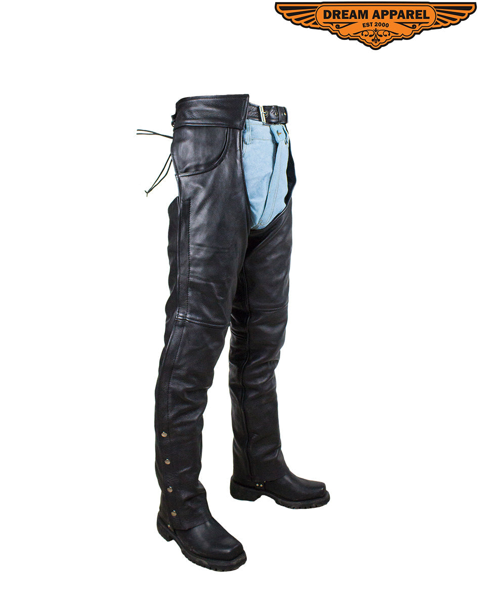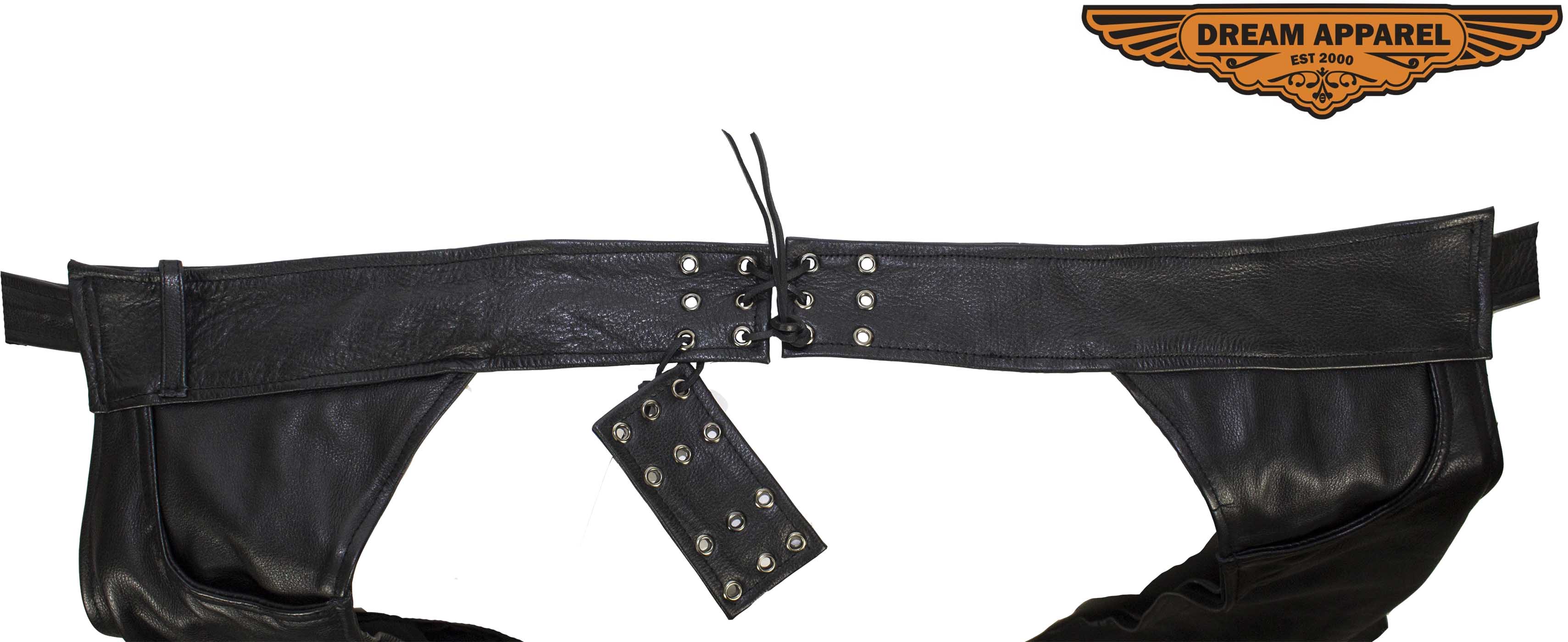 Keep your legs warm and protected in a pair of Dream Apparel's highest grade, quality leather chaps. Made from heavy duty, genuine naked cowhide, our chaps come with zippers that run along the pant leg to button-snaps at the bottom. The soft textile lining in the legs, lacing in the back, and large leather belt all make for great comfort while the deep roomy slip pockets on the hips are great for a wallet or phone. Protect yourself in a pair of stunning leather chaps by Dream Apparel.