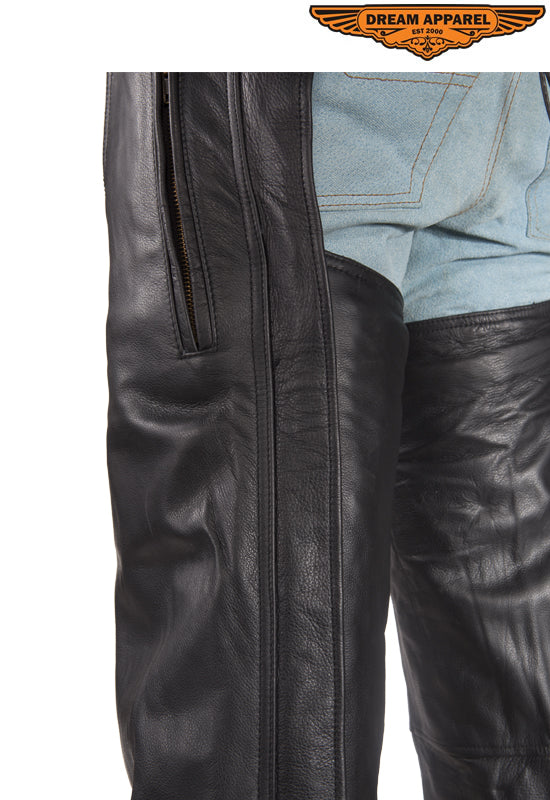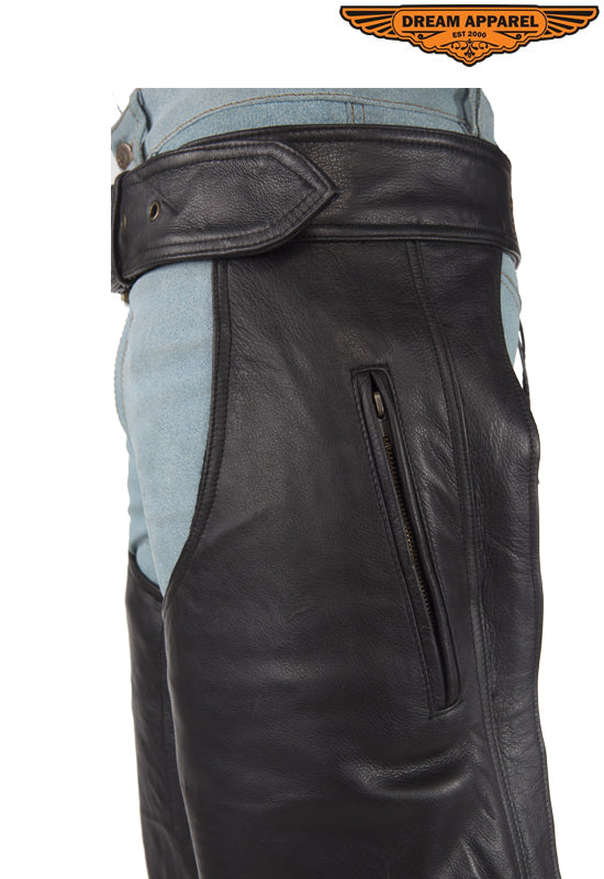 Keep your legs warm and protected in a pair of Dream Apparel's highest grade, quality leather chaps. Our chaps come with zippers that run along the pant leg to button-snaps at the bottom with flaps that hide the zippers. The large leather belt make for great comfort while the deep, roomy zippered pocket is great for a wallet or phone. Protect yourself in a pair of stunning leather chaps by Dream Apparel.