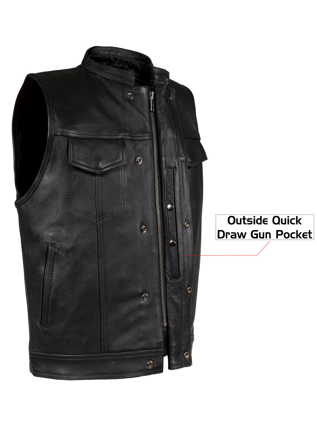 Dream Apparel® understands the value of freedom, comfort, and personal protection. That's why we've made this genuine naked cowhide leather vest, but now with even easier access to your gun. Right between the first set of snaps and the zipper, there is a snapped gun pocket making the retrieval of your gun quicker and less complicated. Along with thats is another deep concealed gun pocket inside with button snaps, an inside slip pocket, and an inside zippered pocket. You're going to love the fit and feel of a premium cowhide leather club vest with a racing style collar, soft leather trim around the neck and arms, and a zippered front closure with button snaps. Make it truly your own by sewing any patches or embroidery onto the one-piece back panel. The two roomy slip pockets on the waist and two breast pockets with button-down flaps give you all the room you need for a days ride and will have you ready for whatever adventures await.
