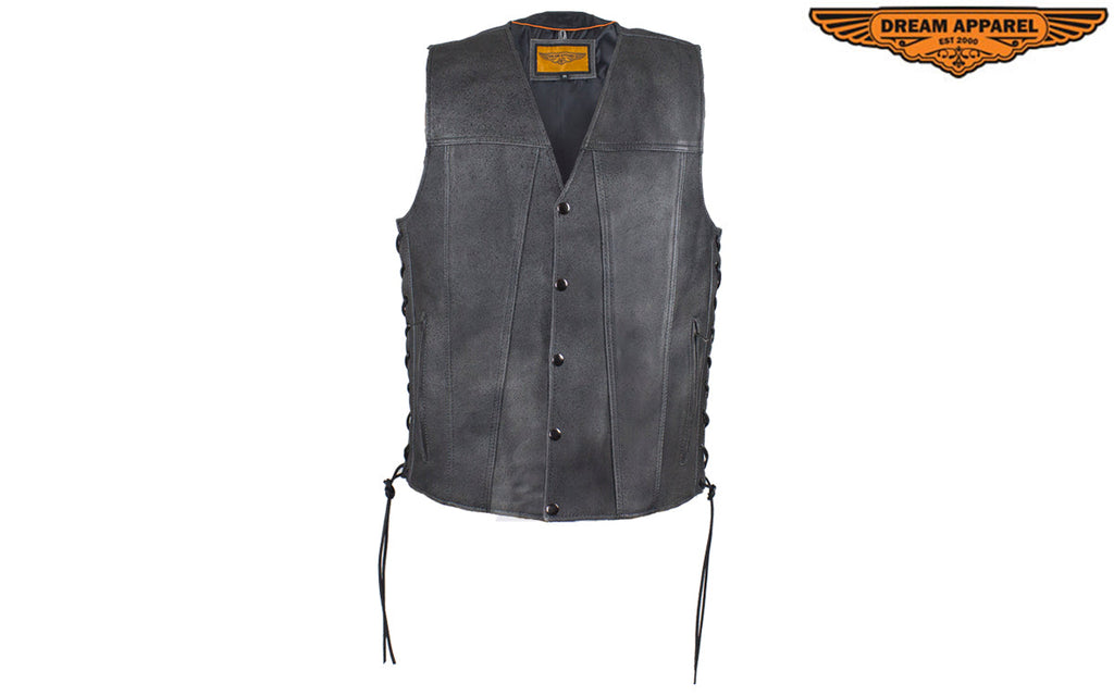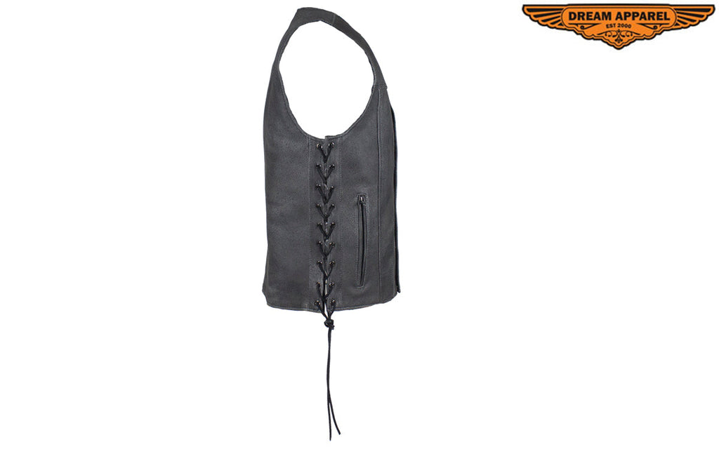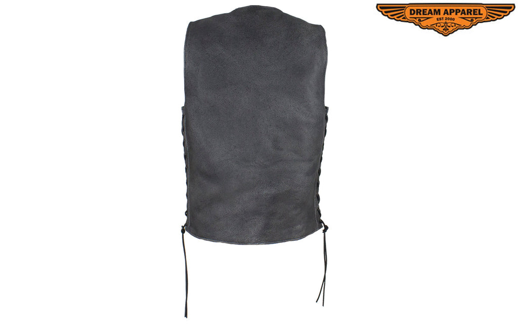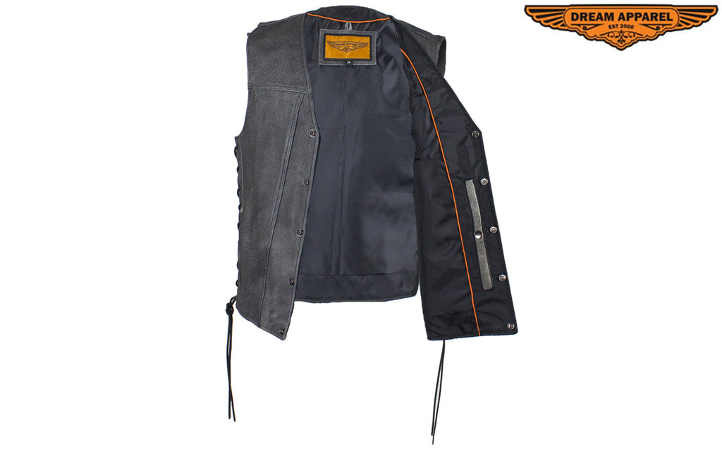 If you never leave home without personal protection, then you'll want our Gray Leather Club Vest with Gun Pockets & Side Laces that has two large interior concealed gun pockets with elastic straps, two additional inside pockets with button snaps, and two large zippered pockets on the waist so you never must. It also comes with a soft nylon lining, black leather side laces, and button-snap front closure so there's no sacrificing comfort and you're going to love putting all your patches on the one-piece back panel. Naturally, these genuine brown leather concealed carry vests sell out fast, so get yours before they're gone.