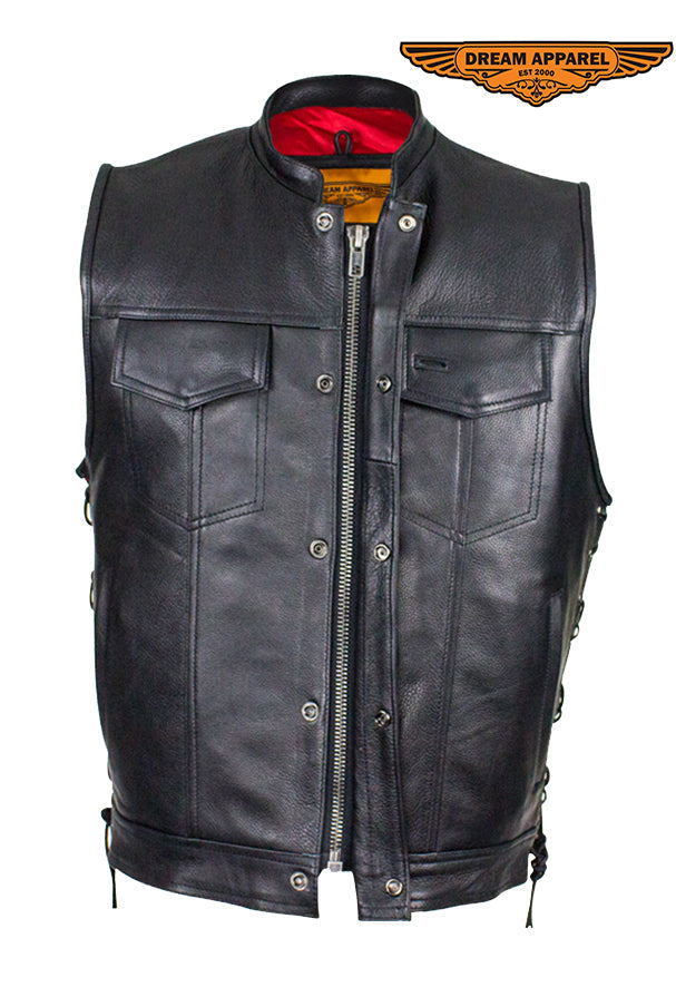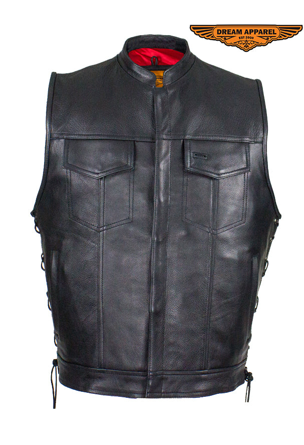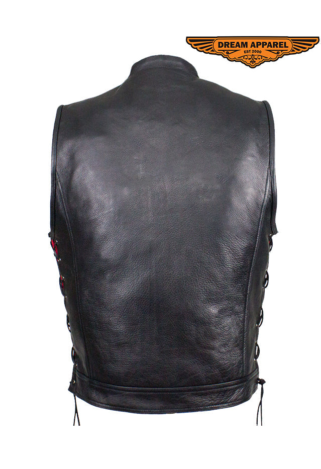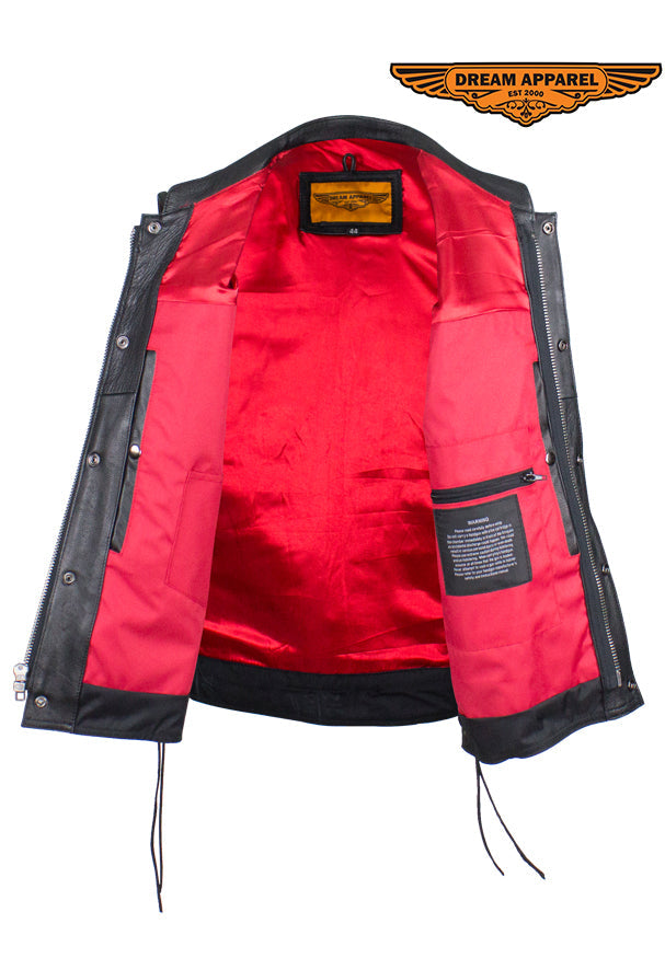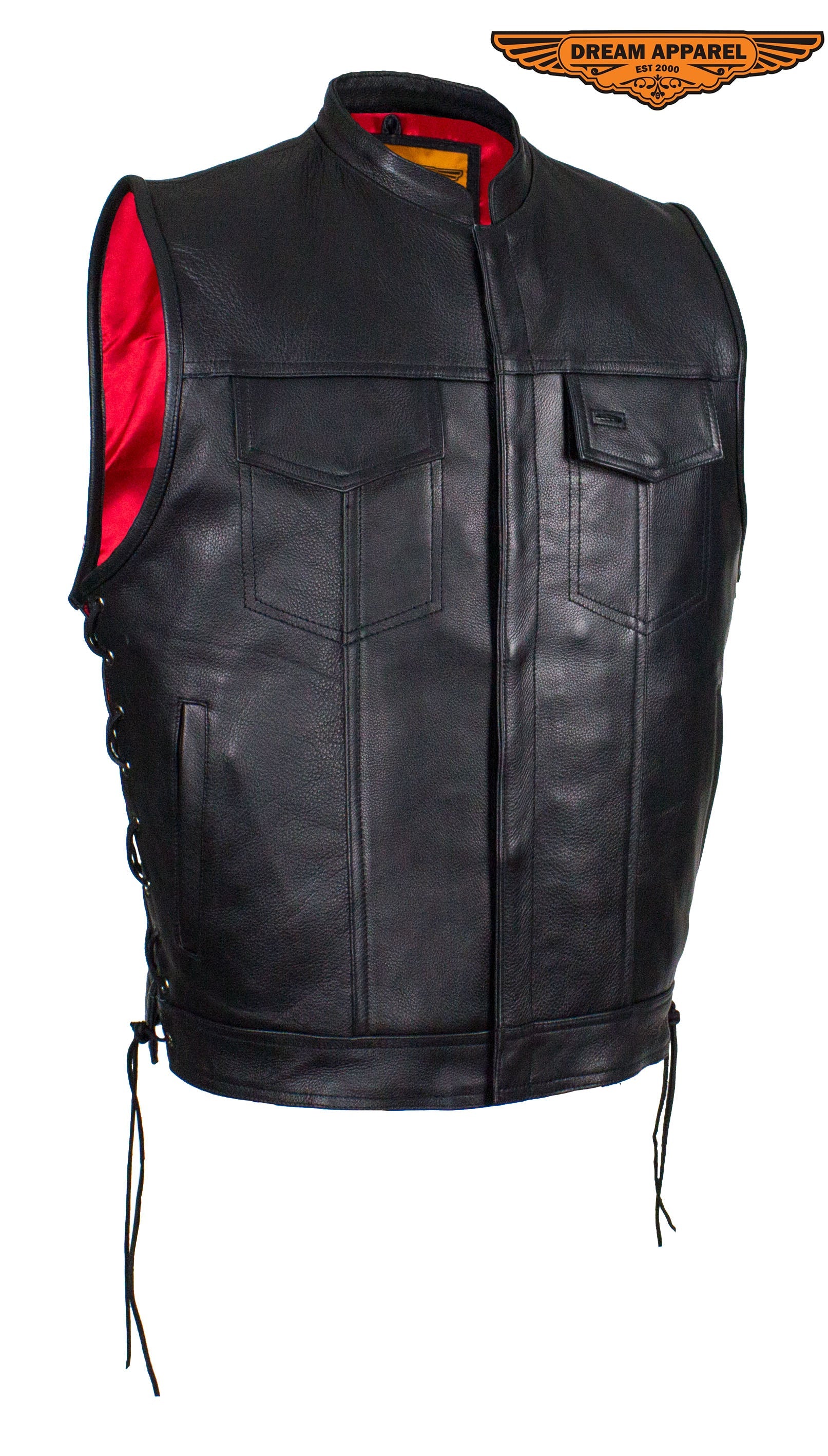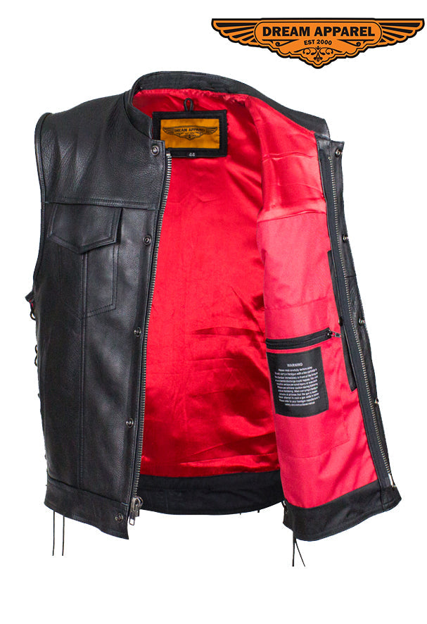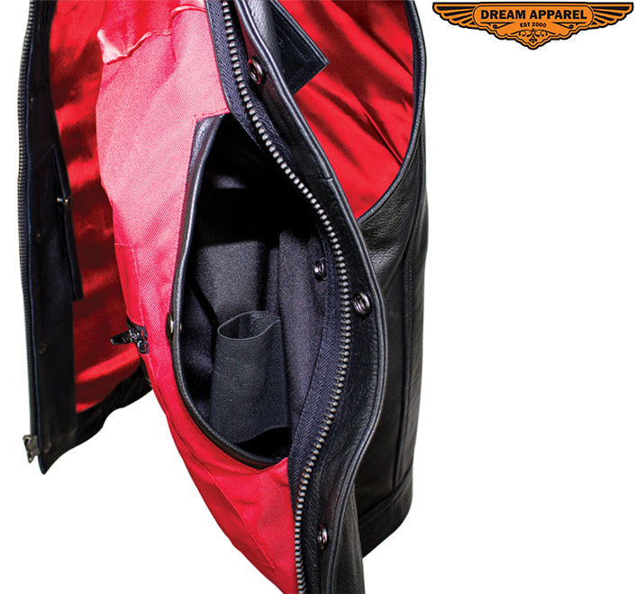 Ride protected in this incredible pleated leather vest with two large concealed gun pockets. Made for bikers that demand their right to carry, this genuine naked cowhide leather vest comes with a zippered front closure with button snaps, an inside slip pocket, and an inside zippered pocket. The bright red liner and genuine black leather side laces keep you comfortable on the road or wherever you go. Two roomy slip pockets on the waist, a right-side button-snap breast pocket, and a left-side button-snap breast pocket that comes with a cut-out in the flap to hold your sunglasses lets you carry everything you need. Finished with a full back panel that lets you show off your club's colors and patches, this incredible vest makes the perfect choice for comfort, looks, and security.