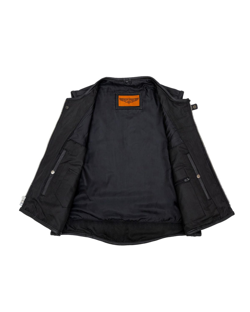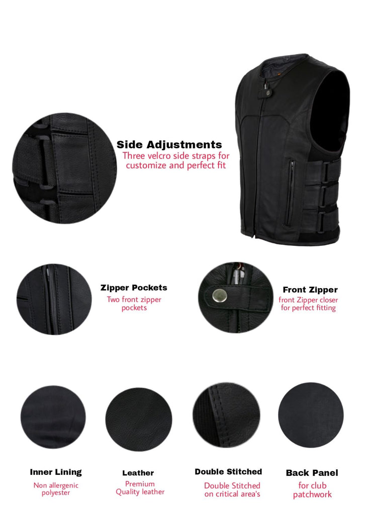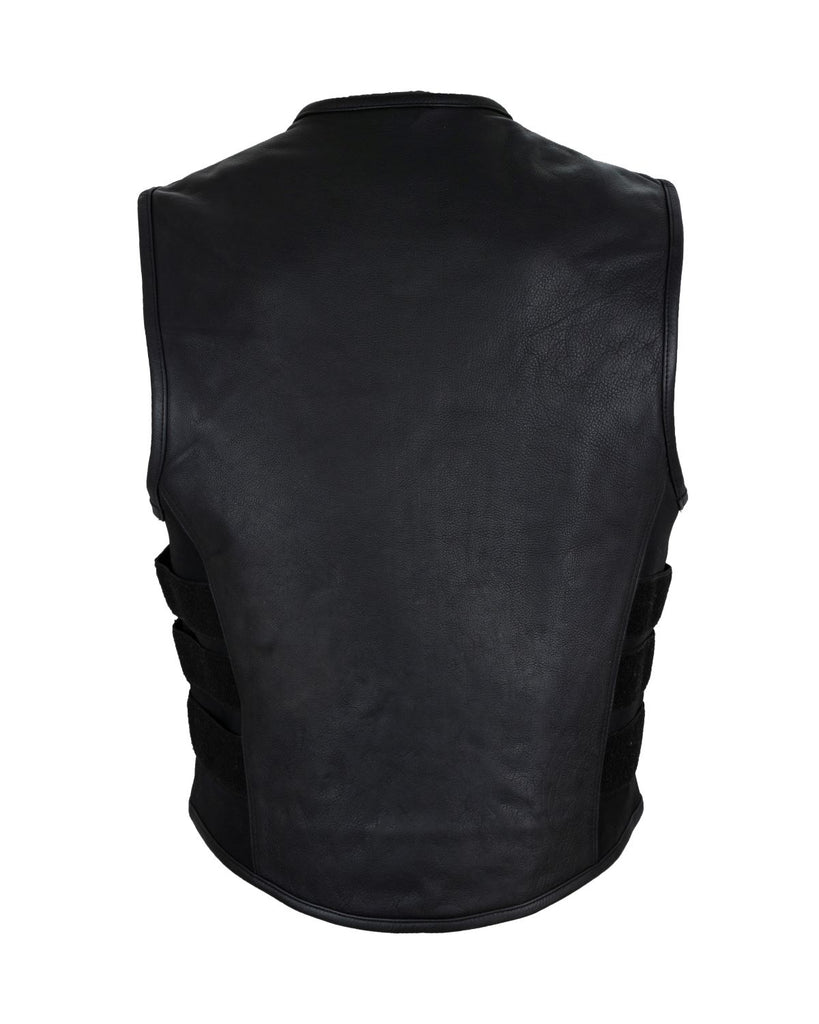 Dream Apparel's Men's Black Leather Vest with Neoprene Sides has all the comfort any biker needs with the added benefit of being able to carry concealed. Pockets include two large gun pockets inside with elastic straps, a slip pocket on the inside right, a zippered pocket on the inside left, and two roomy zippered pockets on the waist. The soft black nylon liner, zippered front closure, and three leather reinforced adjustable Velcro straps on the sides are guaranteed to keep you comfortable however you ride. A full back panel lets you to apply all your club patches and other embroidery making this popular vest a best seller. Order yours today before they're sold out.