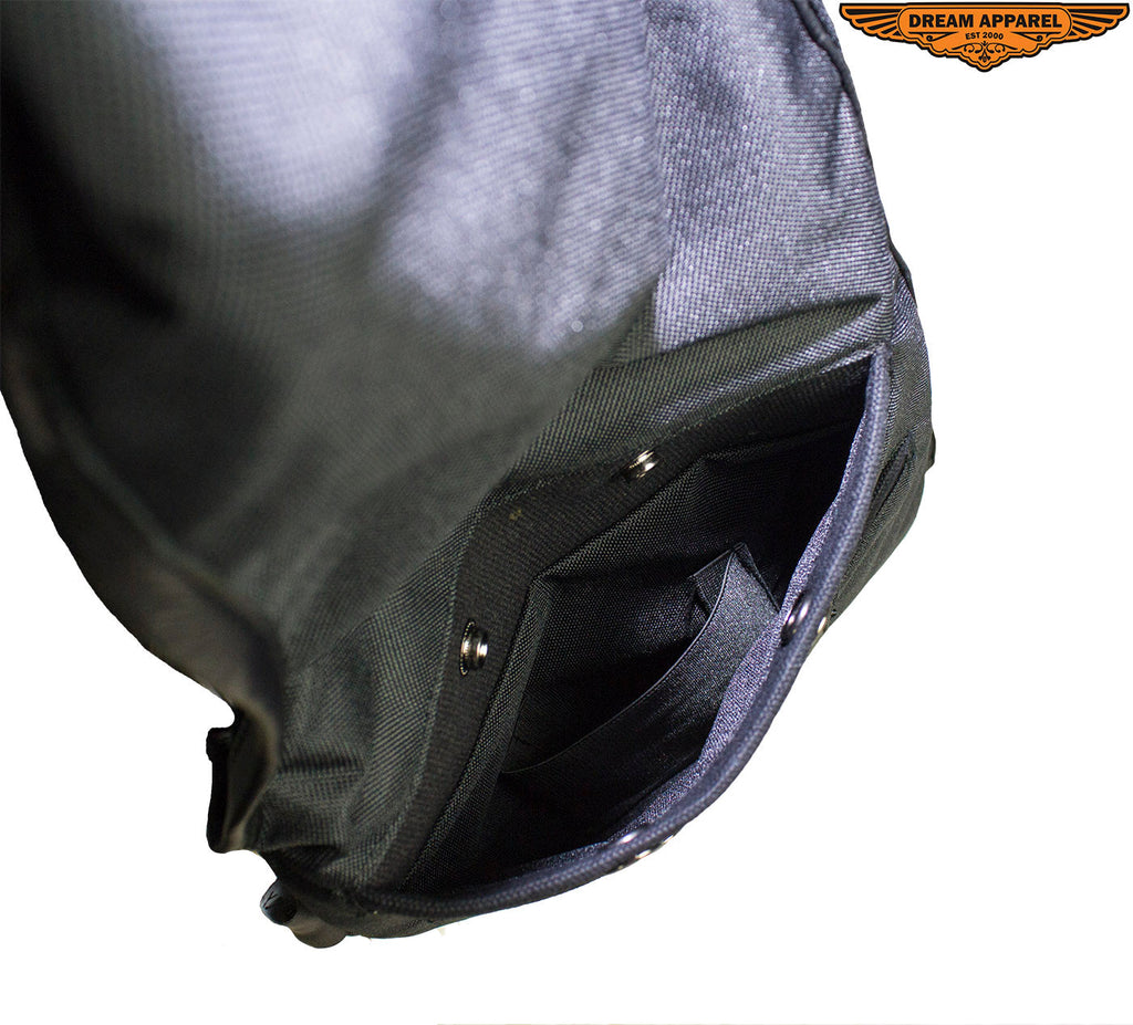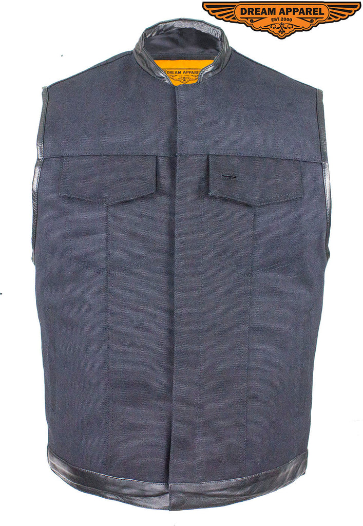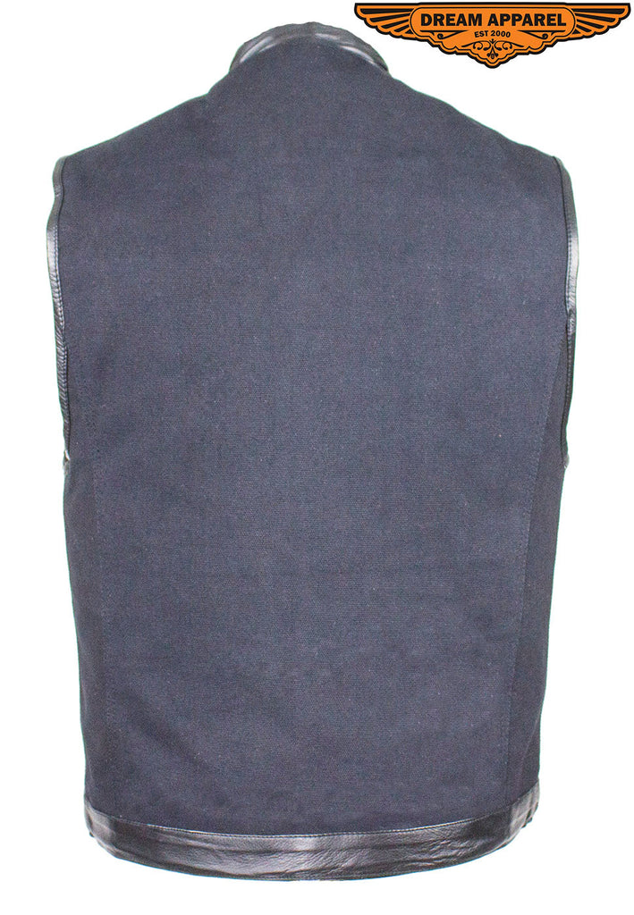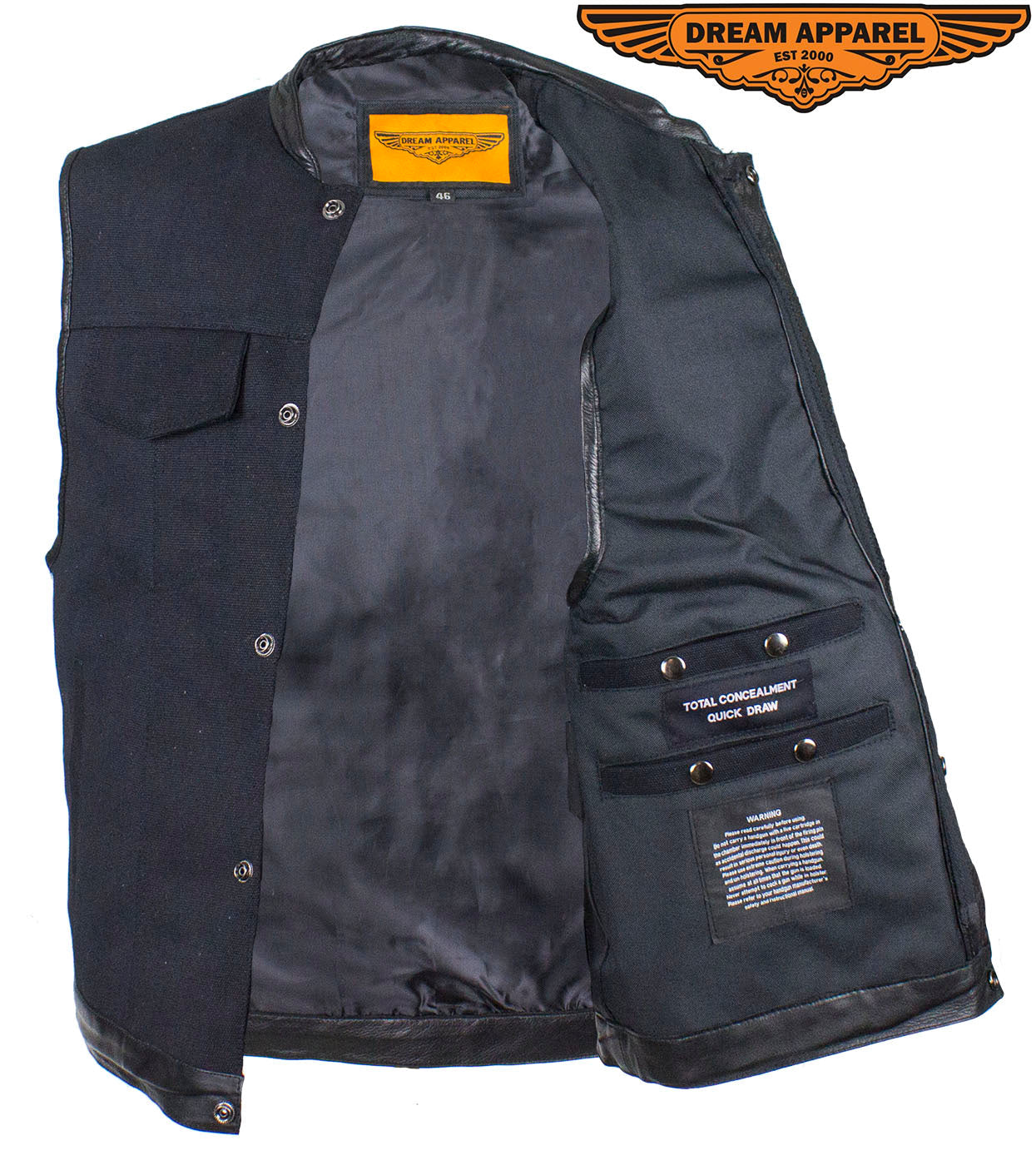 Our mens black canvas motorcycle vest is made from heavy duty black canvas. Our dedicated team of developers has developed a brand new pocket called Total Concealment Quick Draw Pocket. This canvas vest features two large gun pockets with nozzle strap and each pocket features one strap for magazine clip. There are two chest pockets with button snaps closures and left flap has a slot for sunglass holder. The sleek leather collar makes this vest perfect for riding.