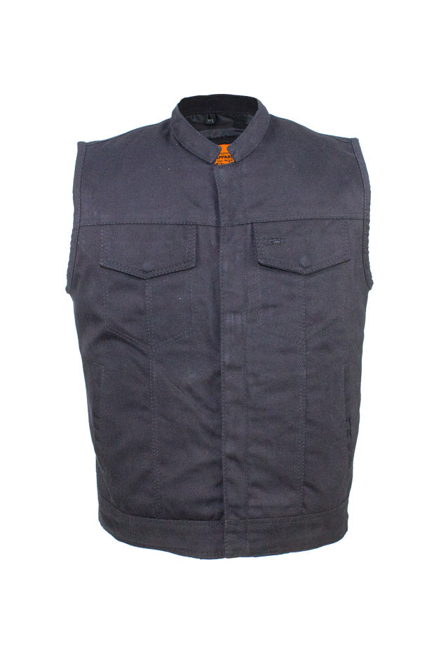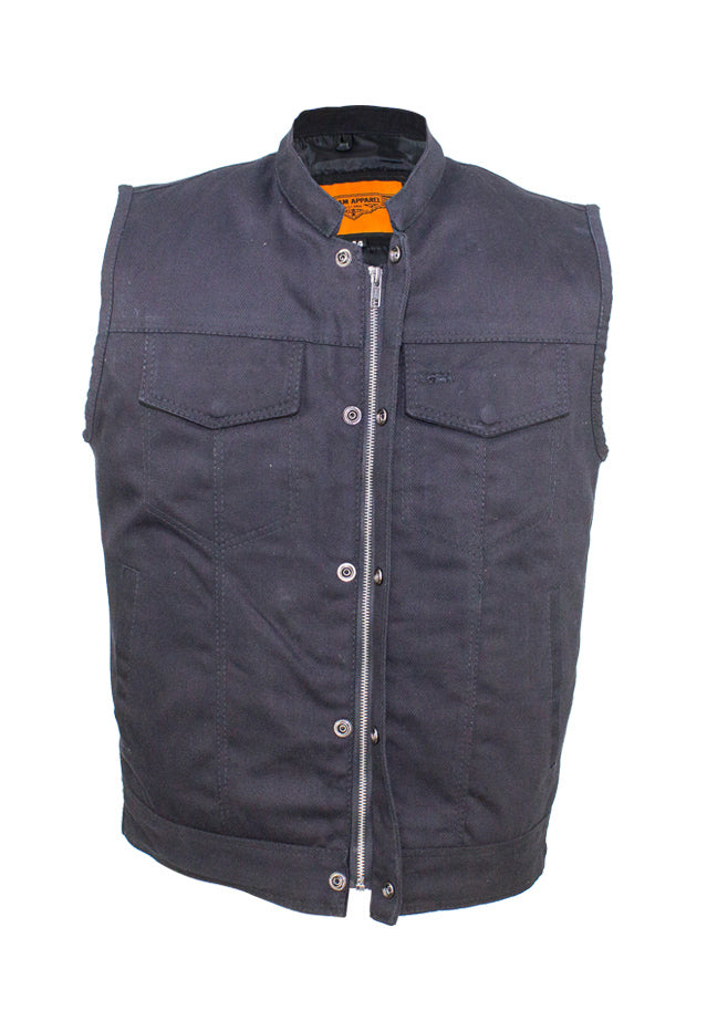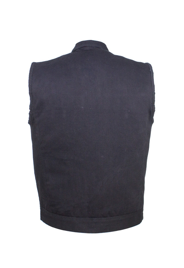 Mens Black Denim Motorcycle CLUB VEST® with Zipper & Button Snap Front Closure, Gun Pockets