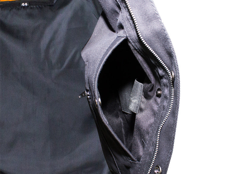 Hit the open road in this great denim vest by Dream Apparel. Made for the rider that values protection and personal freedom, our vest comes with two deep concealed gun pockets inside with button snaps, an inside slip pocket, and an inside zippered pocket. The front closure zips up and buttons to keep you comfortable on the road. Two slip pockets on the waist, a right-side button-snap breast pocket, and a left-side button-snap breast pocket that comes with a cut-out in the flap for sunglasses. The full back panel allows you to show your club's colors and patches making this vest a great choice for comfort, looks, and security.