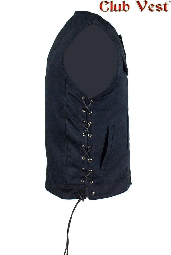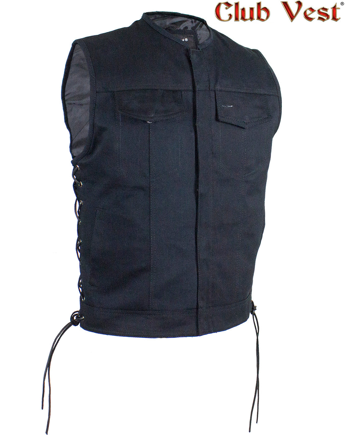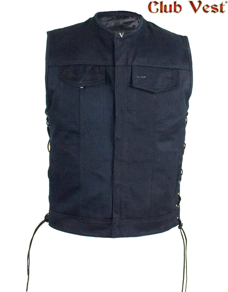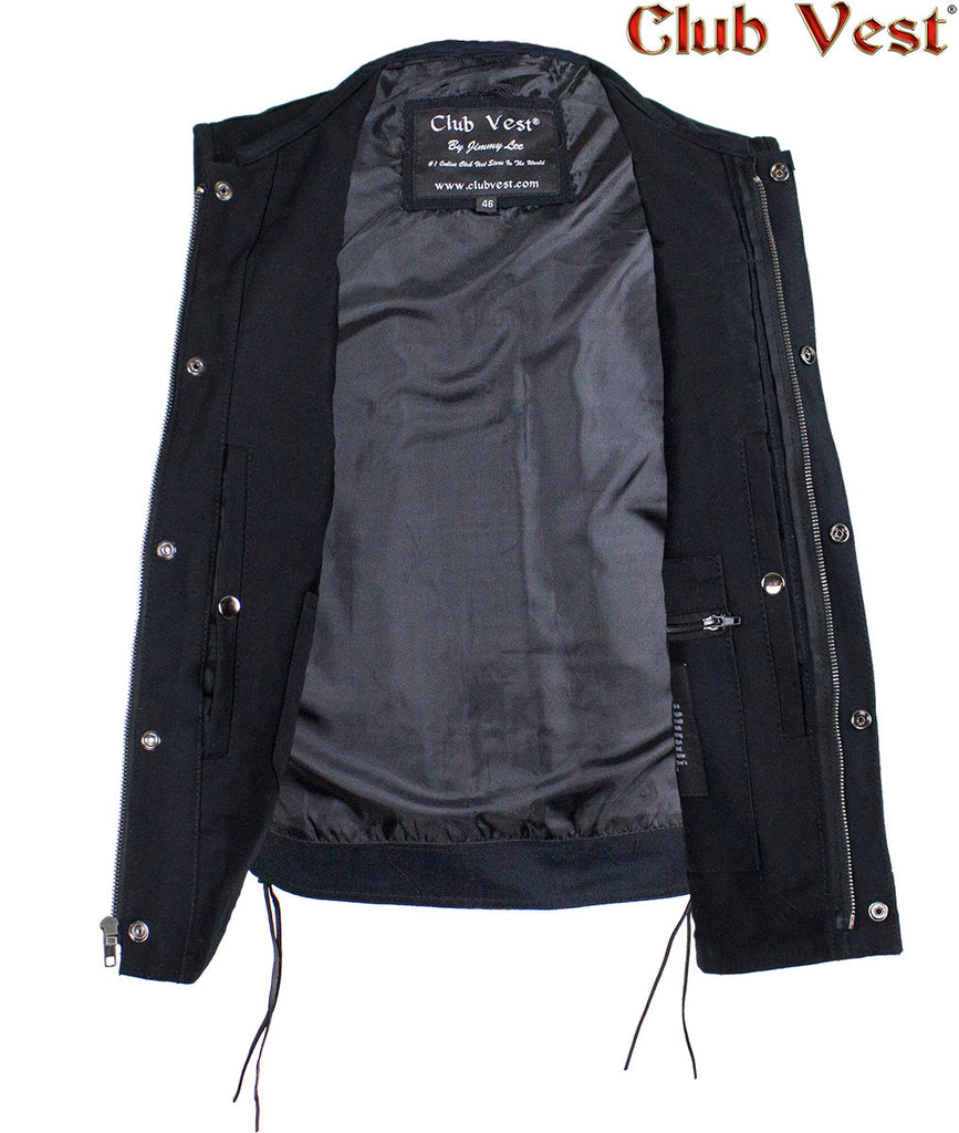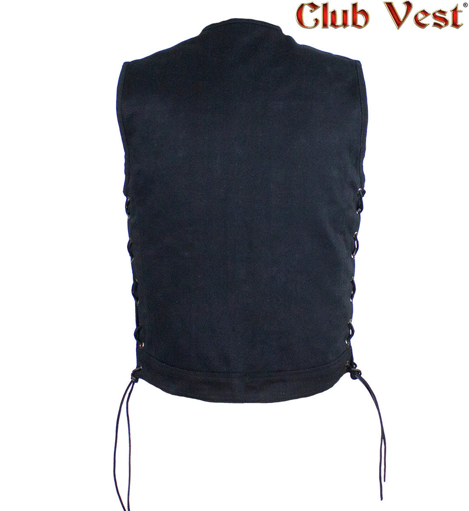 Hit the road in this black denim vest by Club Vest®. Made for riding with protection in mind, this vest comes with button snaps over a zippered front closure, genuine black leather side laces, and a soft inner lining to keep you comfortable on the road. Two deep concealed gun pockets, a slip pocket, and a zippered pocket inside keep you safe and secure. Two slip pockets and two breast pockets outside leave you plenty of room for anything else you'd care to bring on your trip. The full back panel allows you to proudly display your club's colors and accomplishments making this vest an excellent choice for the rider that values protection and simplicity.