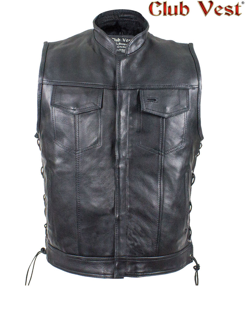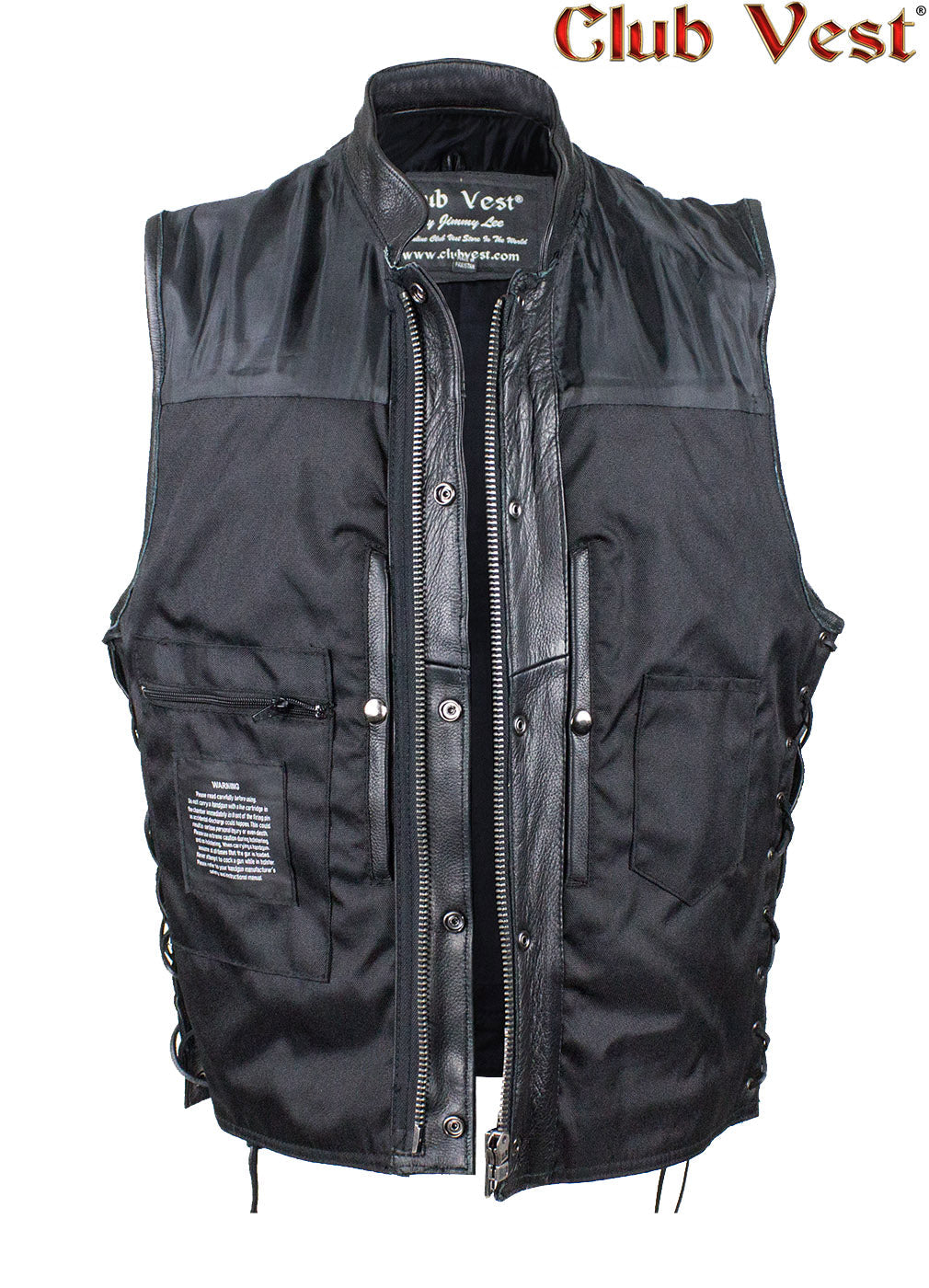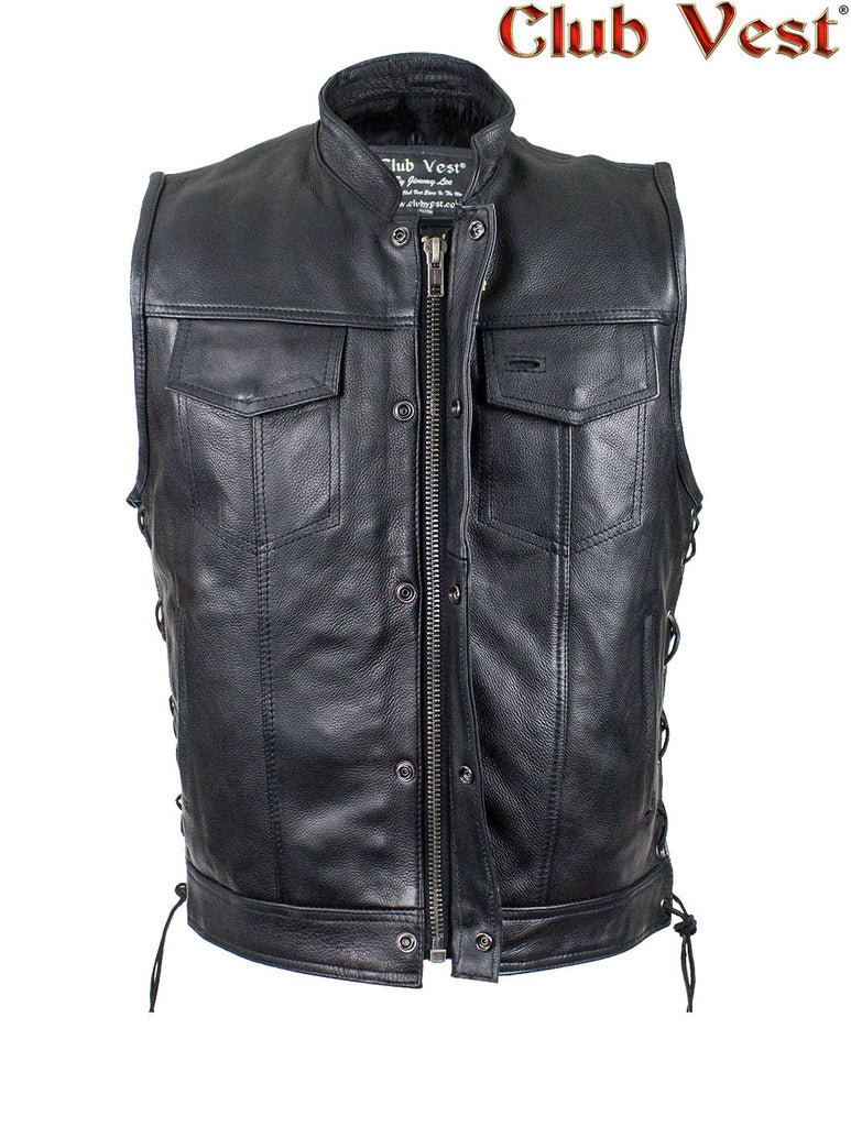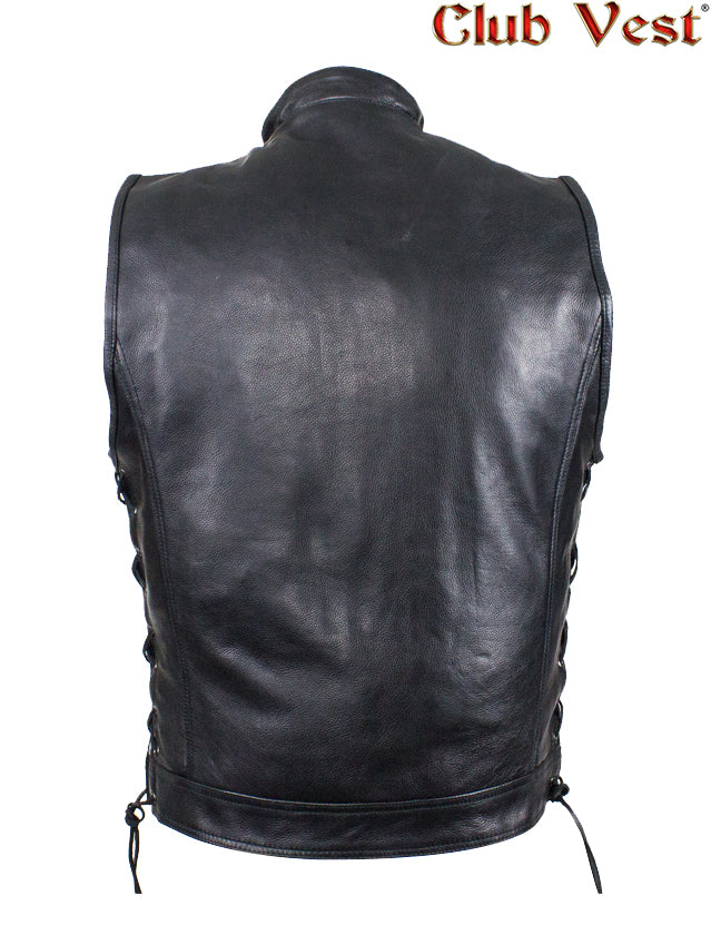 and button snaps, an inside slip pocket, and an inside zippered pocket. The zippered front closure with button snaps and genuine leather side laces keeps you comfortable wherever you ride. Two slip pockets on the waist, a right-side button-snap breast pocket, and a left-side button-snap breast pocket that comes with a cut-out in the flap for sunglasses provide loads of room for all your valuables while the clean back panel lets you show your club's logo and accomplishments making this a great vest at an incredible price.