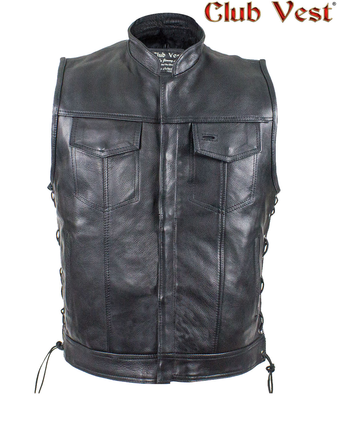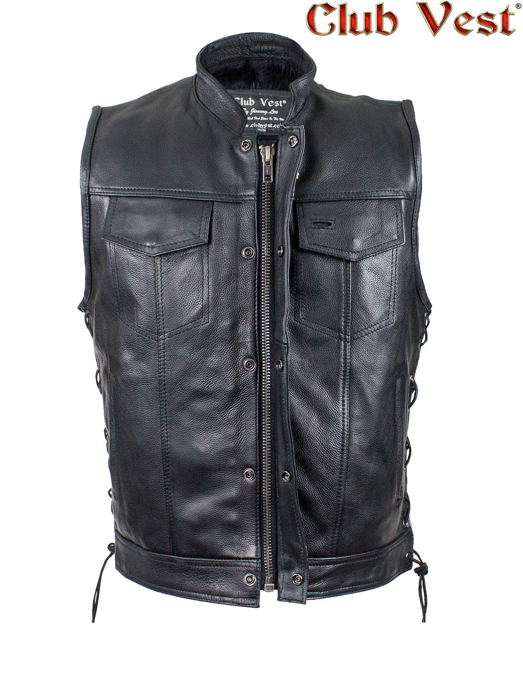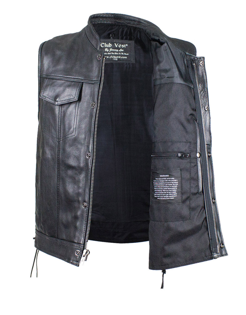 and button snaps, an inside slip pocket, and an inside zippered pocket. The zippered front closure with button snaps and genuine leather side laces keeps you comfortable wherever you ride. Two slip pockets on the waist, a right-side button-snap breast pocket, and a left-side button-snap breast pocket that comes with a cut-out in the flap for sunglasses provide loads of room for all your valuables while the clean back panel lets you show your club's logo and accomplishments making this a great vest at an incredible price.