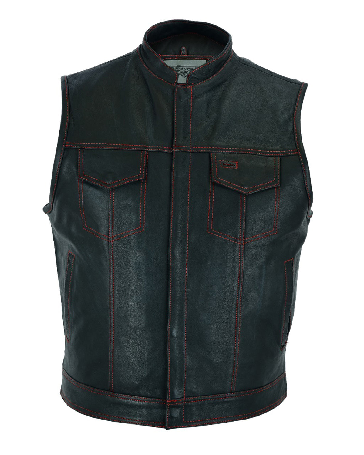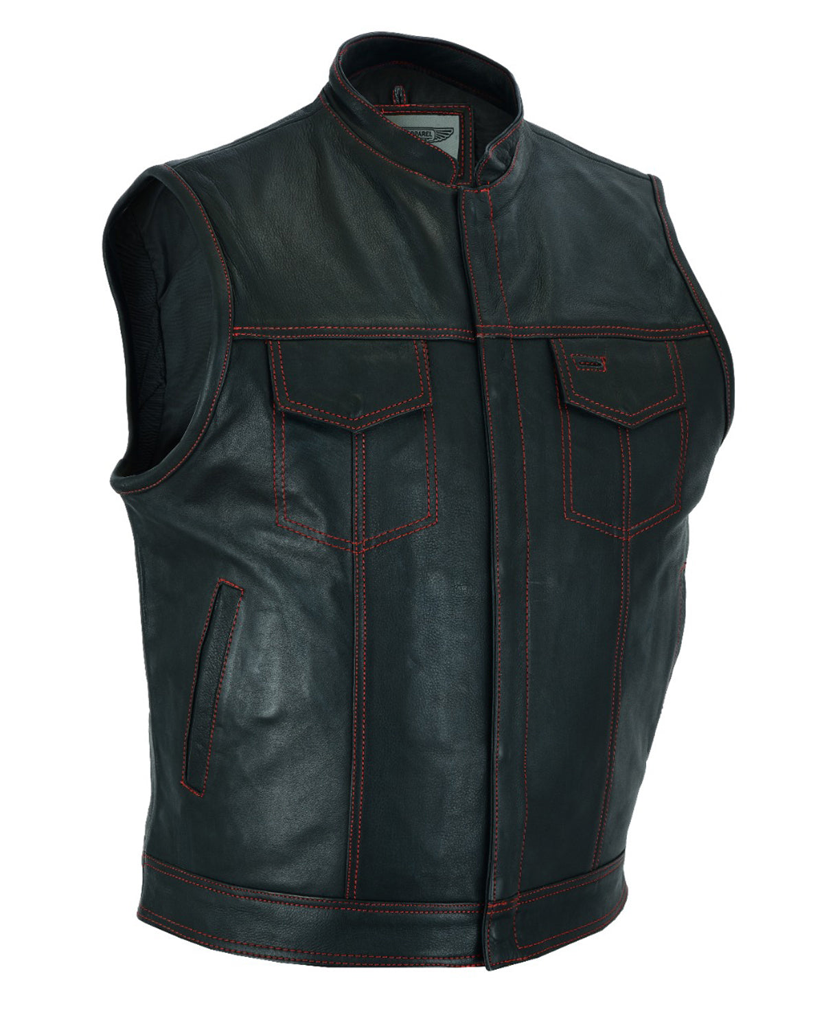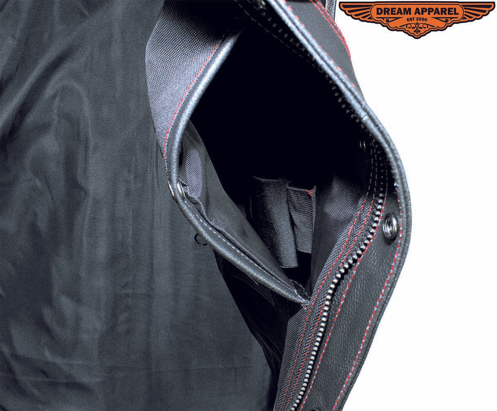 CLUB VEST understands the value of freedom, comfort, style and personal protection. That's why we've created this genuine split leather vest with beautiful red stitching which features two gun pockets on both sides. Along with that, you're giving two slip pockets on the front of the vest along with two more buttoned pockets on the inside. Lastly, a zippered pocket can also be found along the inside of the vest. You're going to love the fit and feel of a premium split leather club vest with a racing style collar, soft leather trim around the neck and arms, and a zippered front closure with button snaps. Make it truly your own by sewing any patches or embroidery onto the one-piece back panel. You got all the room you need for a days ride and will really prepare you for all the adventures that lie ahead.
