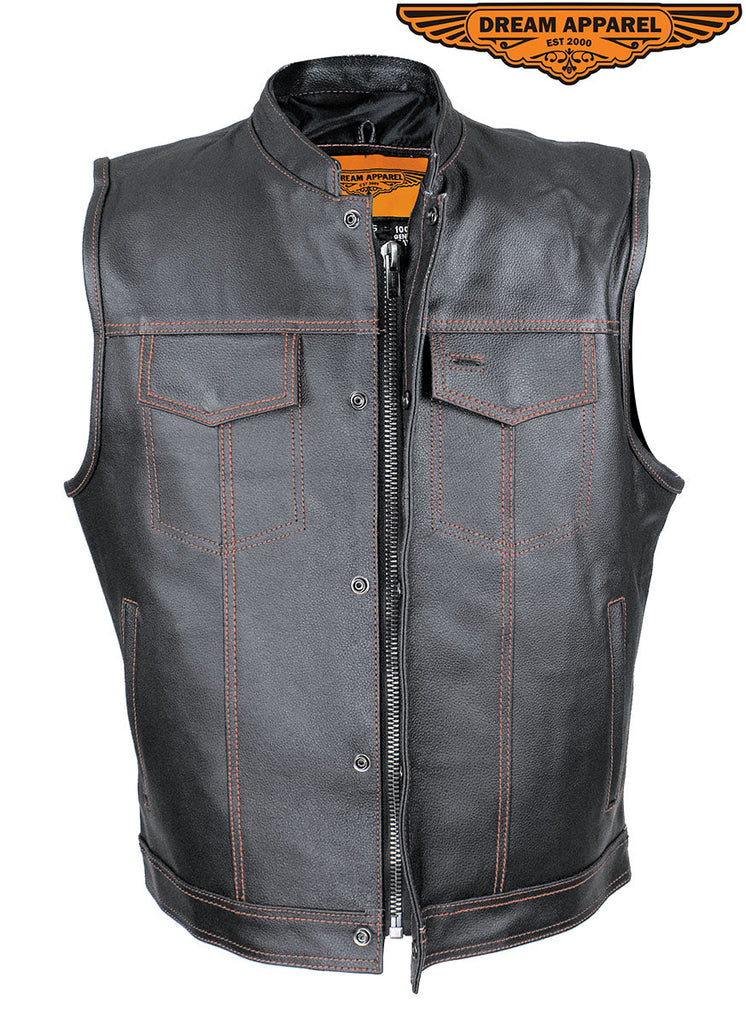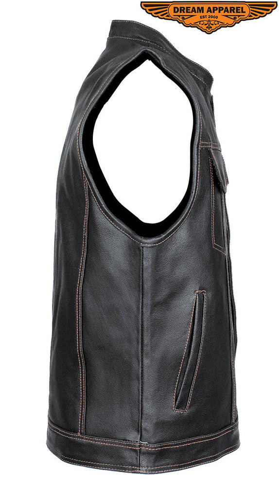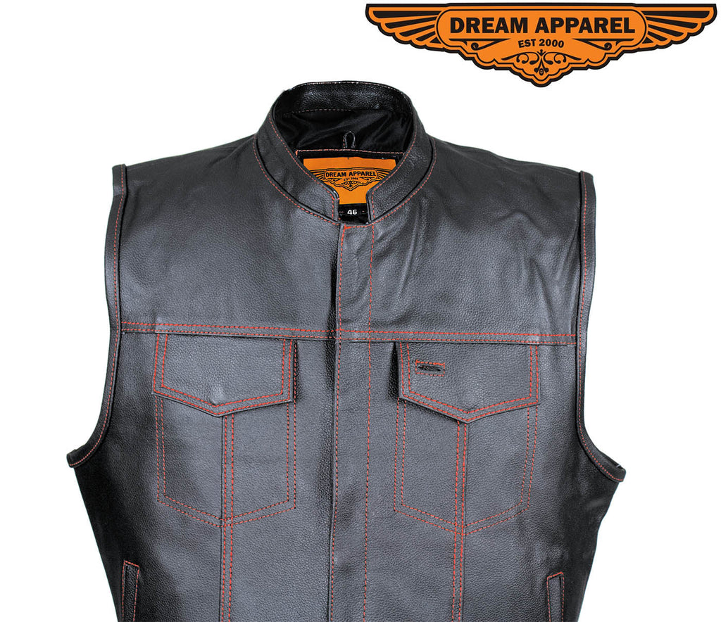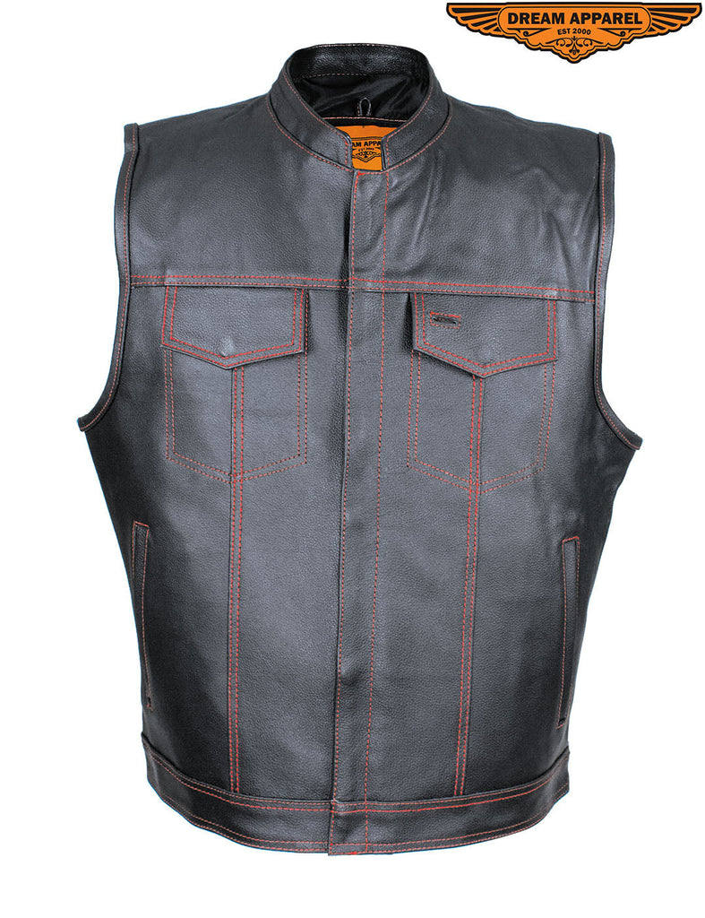 CLUB VEST understands the value of freedom, comfort, style and personal protection. That's why we've created this genuine split leather vest with beautiful red stitching which features two gun pockets on both sides. Along with that, you're giving two slip pockets on the front of the vest along with two more buttoned pockets on the inside. Lastly, a zippered pocket can also be found along the inside of the vest. You're going to love the fit and feel of a premium split leather club vest with a racing style collar, soft leather trim around the neck and arms, and a zippered front closure with button snaps. Make it truly your own by sewing any patches or embroidery onto the one-piece back panel. You got all the room you need for a days ride and will really prepare you for all the adventures that lie ahead.