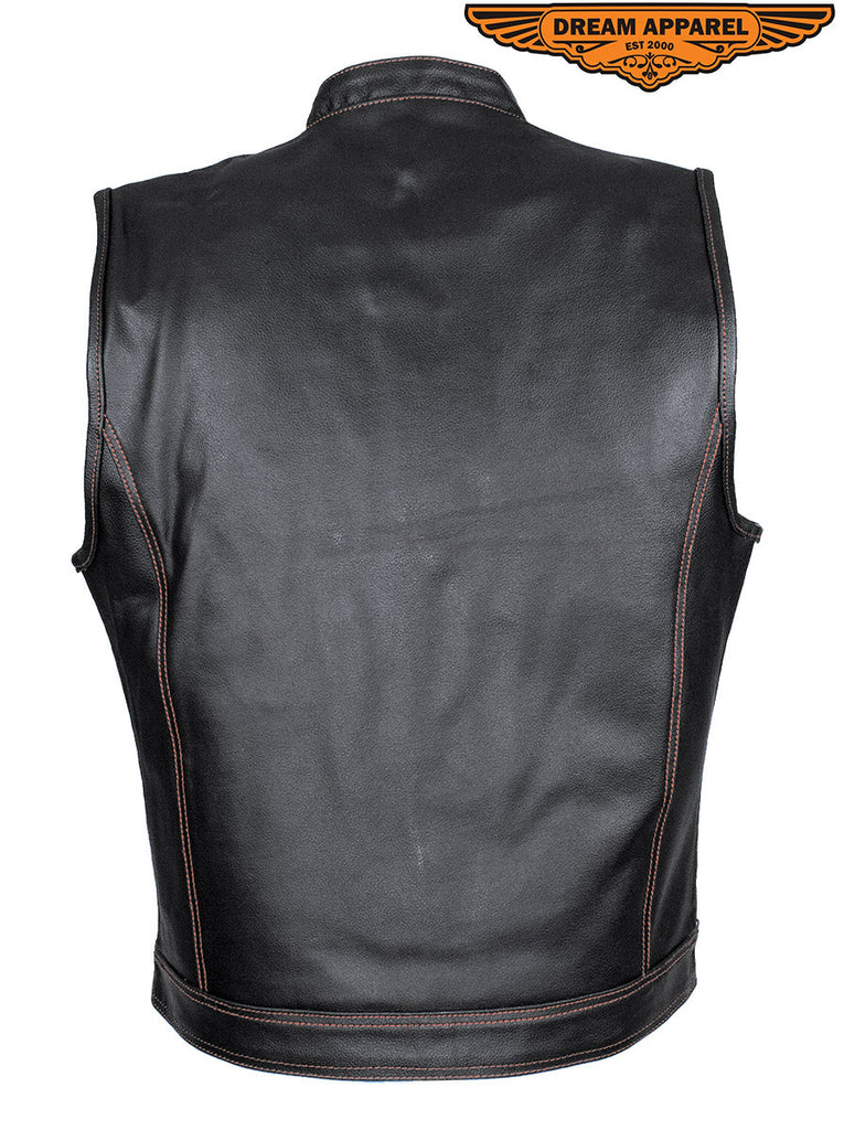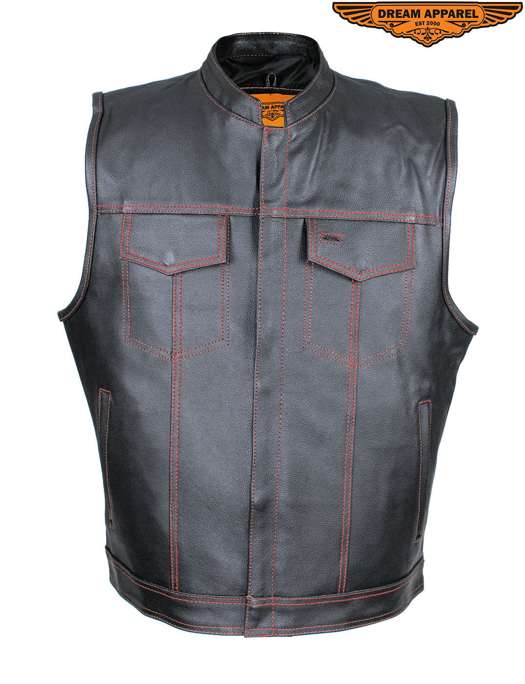 Men's Black Split Leather Motorcycle Vest Red Stitching