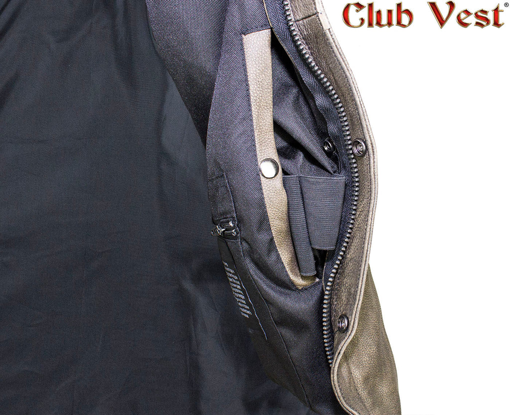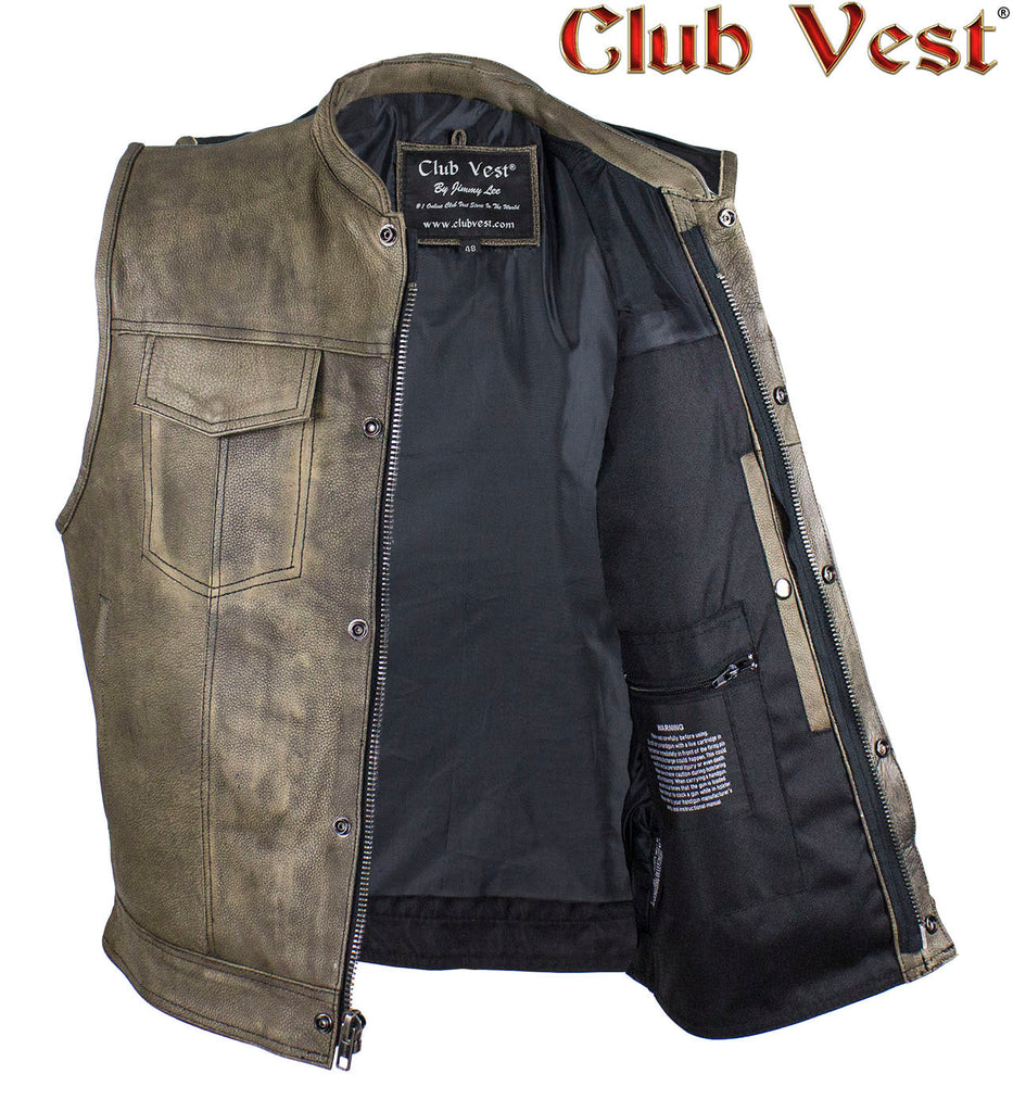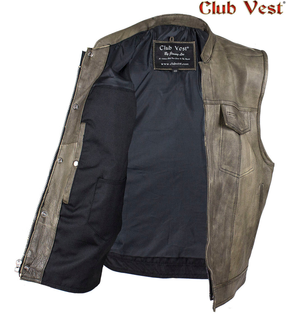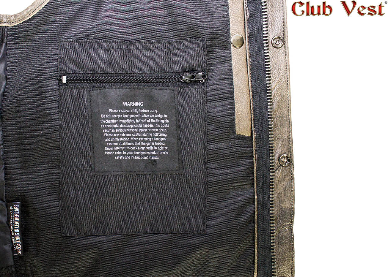 If you choose to carry a concealed handgun, then Club Vest's® distressed brown leather vest with two deep concealed gun pockets inside with button snaps, an inside slip pocket, and an inside zippered pocket is something you should own. Made from premium cowhide leather with a racing inspired collar, soft leather trim around the neck and arms, and a zippered front closure with button snaps your comfort's assured as well as your safety. Make it your own and sew any patches or embroidery you have onto the clean back panel. Two slip pockets on the waist and two roomy breast pockets with button-down flaps provide more room on front for any personal items. This amazing vest sells out fast so make sure you order yours today.
