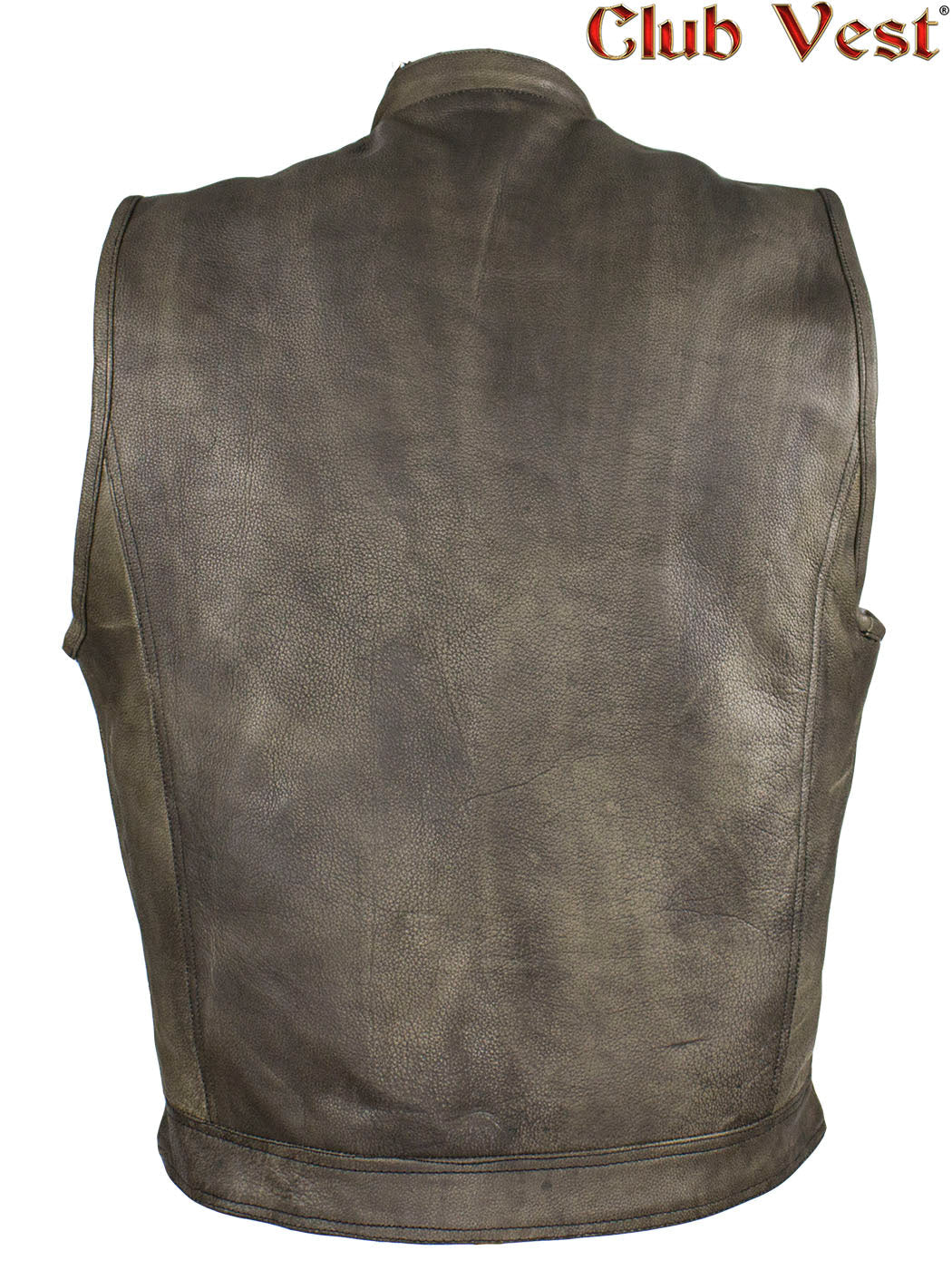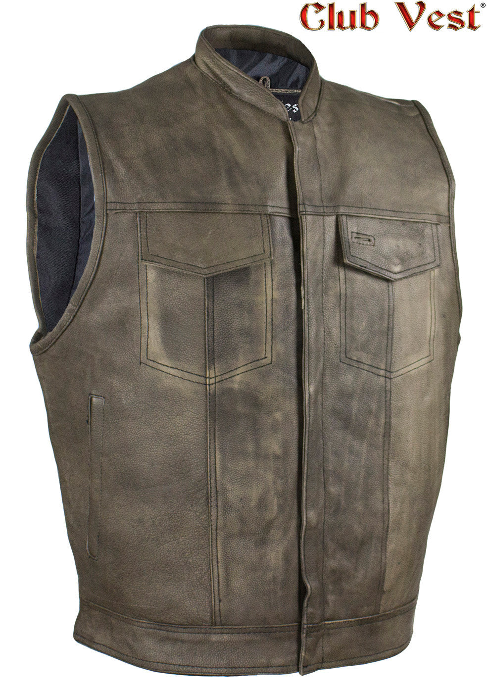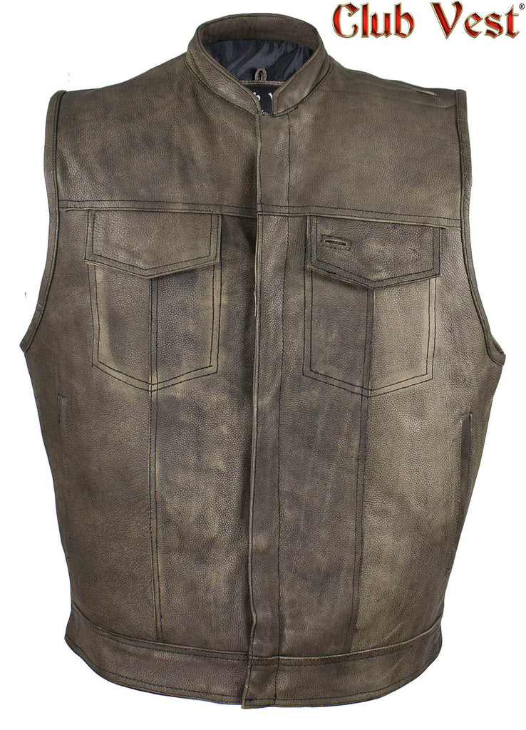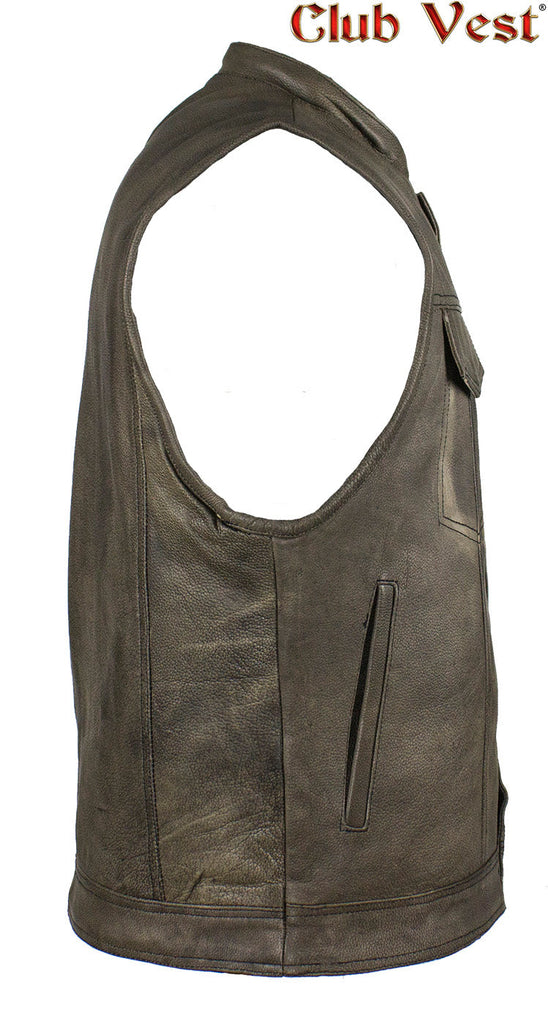 If you choose to carry a concealed handgun, then Club Vest's® distressed brown leather vest with two deep concealed gun pockets inside with button snaps, an inside slip pocket, and an inside zippered pocket is something you should own. Made from premium cowhide leather with a racing inspired collar, soft leather trim around the neck and arms, and a zippered front closure with button snaps your comfort's assured as well as your safety. Make it your own and sew any patches or embroidery you have onto the clean back panel. Two slip pockets on the waist and two roomy breast pockets with button-down flaps provide more room on front for any personal items. This amazing vest sells out fast so make sure you order yours today.