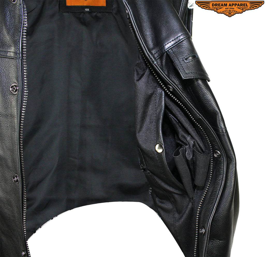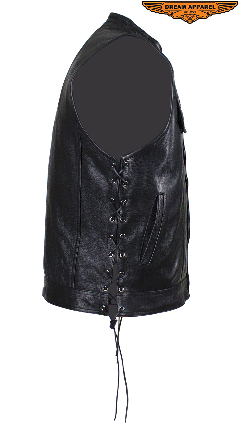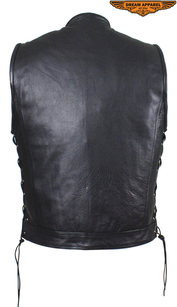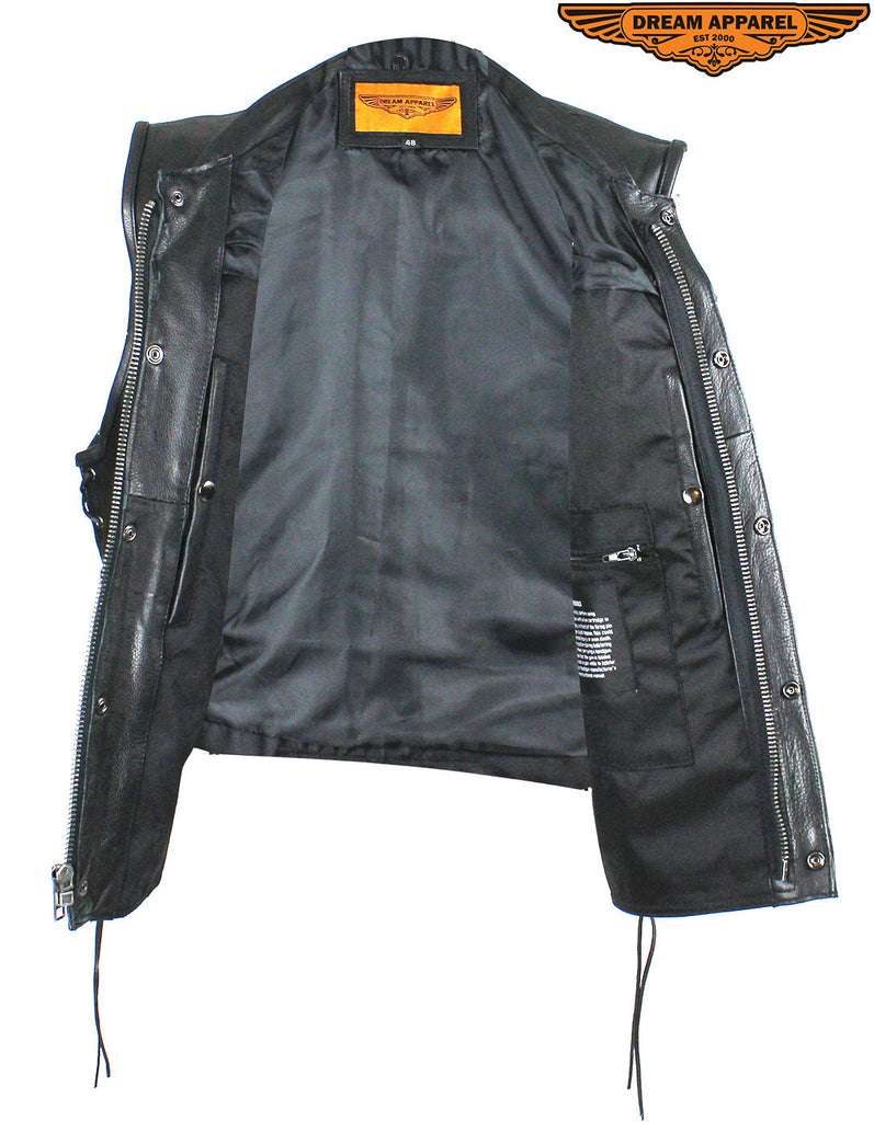 Head out on the highway in this pleated genuine naked cowhide leather vest by Dream Apparel. Made for riders that demand protection, our vest comes with two deep concealed gun pockets with elastic straps and button snaps, an inside slip pocket, and an inside zippered pocket. The zippered front closure with button snaps and genuine leather side laces keep you comfortable wherever you ride. Two slip pockets on the waist, a right-side button-snap breast pocket, and a left-side button-snap breast pocket that comes with a cut-out in the flap for sunglasses provide loads of room for all your valuables while the clean back panel lets you show your club's logo and accomplishments making this a great vest at an incredible price.