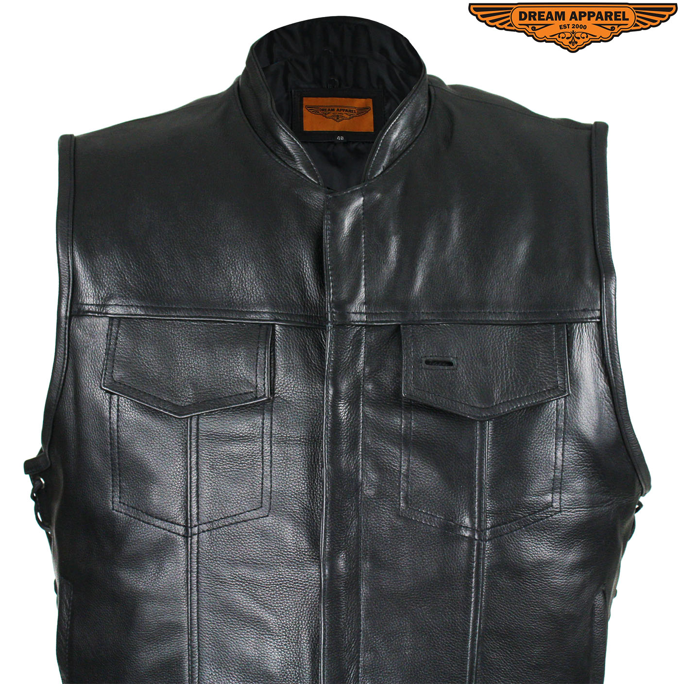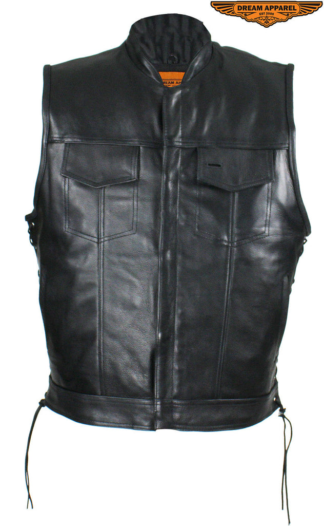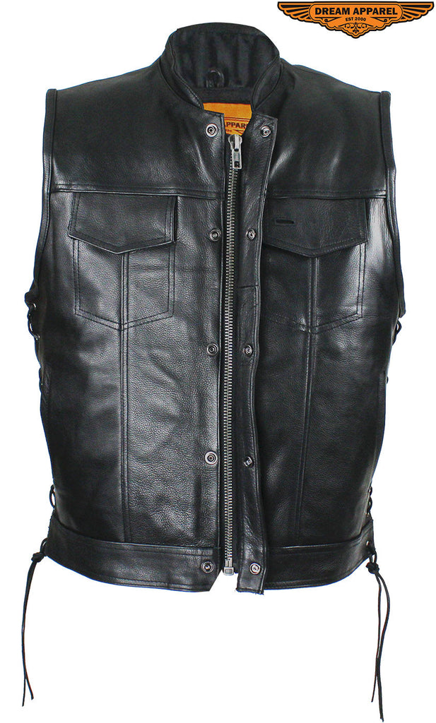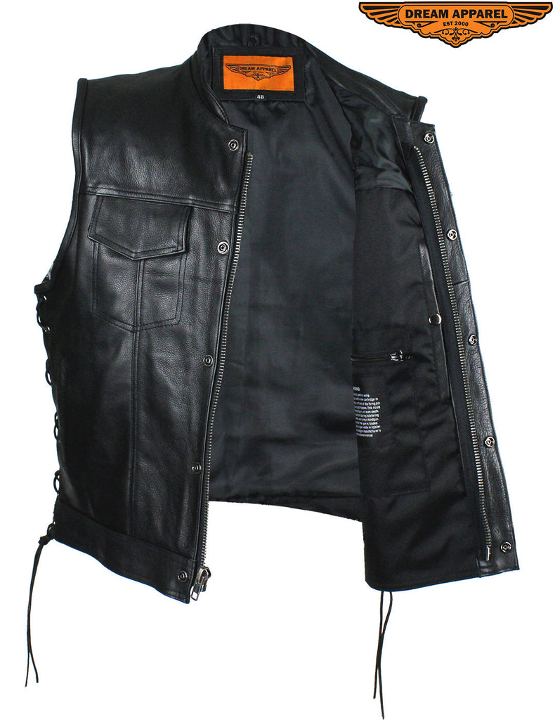 Head out on the highway in this pleated genuine naked cowhide leather vest by Dream Apparel. Made for riders that demand protection, our vest comes with two deep concealed gun pockets with elastic straps and button snaps, an inside slip pocket, and an inside zippered pocket. The zippered front closure with button snaps and genuine leather side laces keep you comfortable wherever you ride. Two slip pockets on the waist, a right-side button-snap breast pocket, and a left-side button-snap breast pocket that comes with a cut-out in the flap for sunglasses provide loads of room for all your valuables while the clean back panel lets you show your club's logo and accomplishments making this a great vest at an incredible price.
