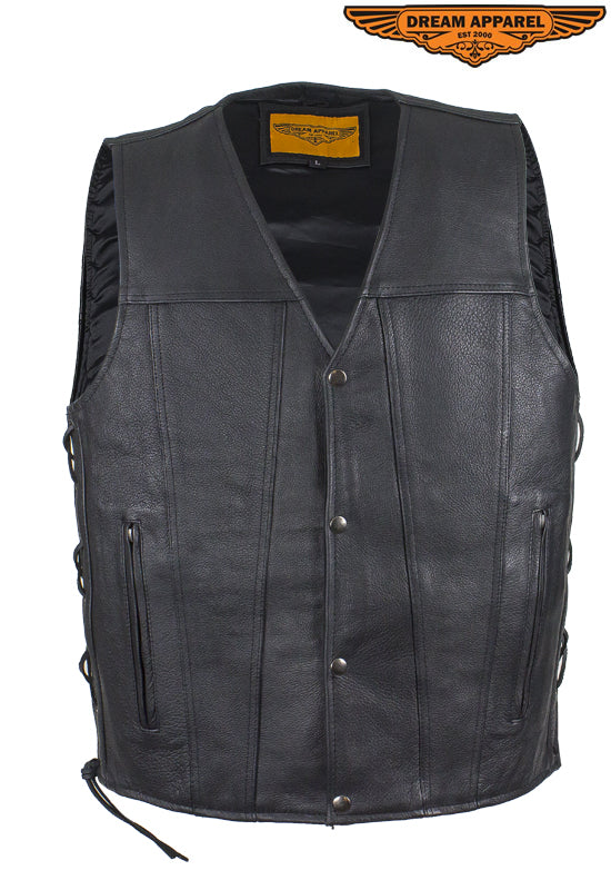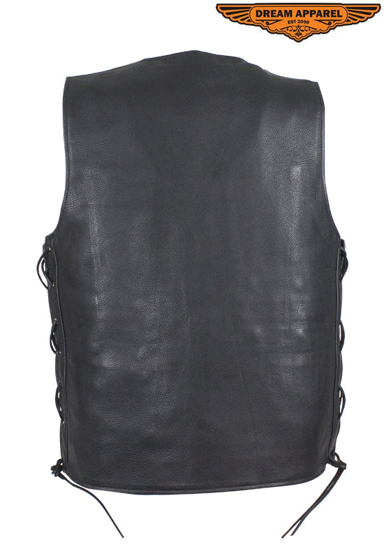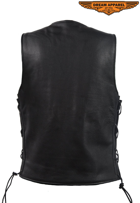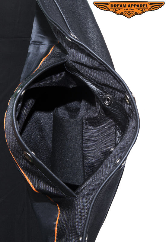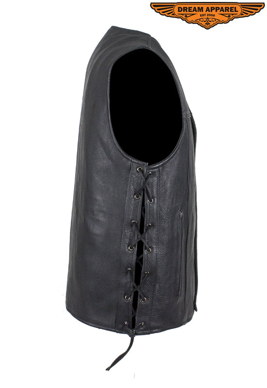 If you ride through some dangerous neighborhoods, then our men's leather vest with gun pockets and side laces is a must. It comes with two large interior concealed gun pockets with elastic straps and two large zippered pockets on the waist that provide ample room for extra rounds. Additional features include a soft nylon lining and button-snaps for added fit and comfort. Plus, you can add your own patches to the one-piece back panel. Naturally, these vests sell out fast. Get your order in today.