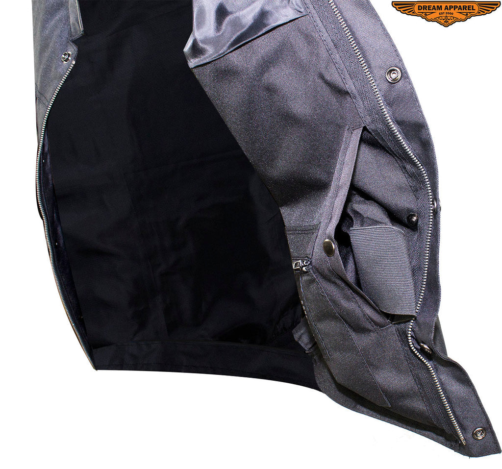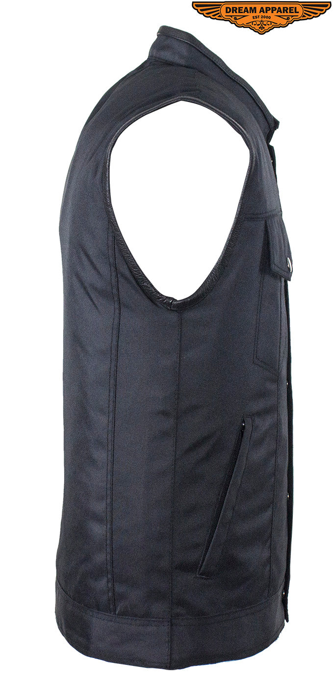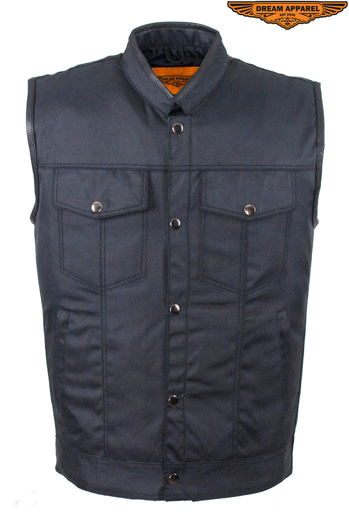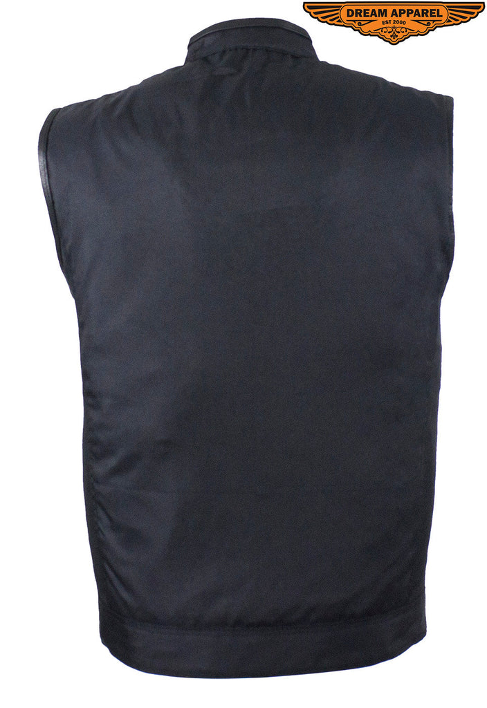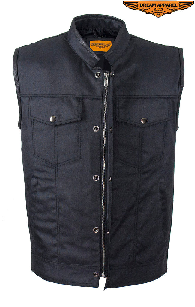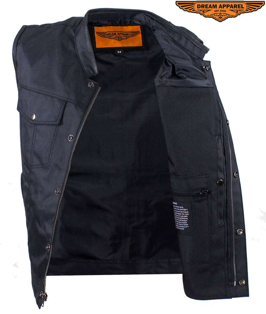 Let Dream Apparel keep you looking good and protected on your next adventure with our rugged, back textile, Motorcycle club vest. Our vest includes a soft, black textile lining, leather trim along the neck and arms, a race inspired collar, and a zippered front closure. Two deep concealed gun pockets keep you safe on the road. With the two zippered pockets on the waist, two breast pockets with button-snap closures, one slip pocket on the inside right, and one zippered pocket on the inside left you're prepared for anything. Lastly, with the full back panel you can sew on your club's logo and other patches and make this vest truly your own. Get your oder in today because at this price this incredible vests will sell quickly.