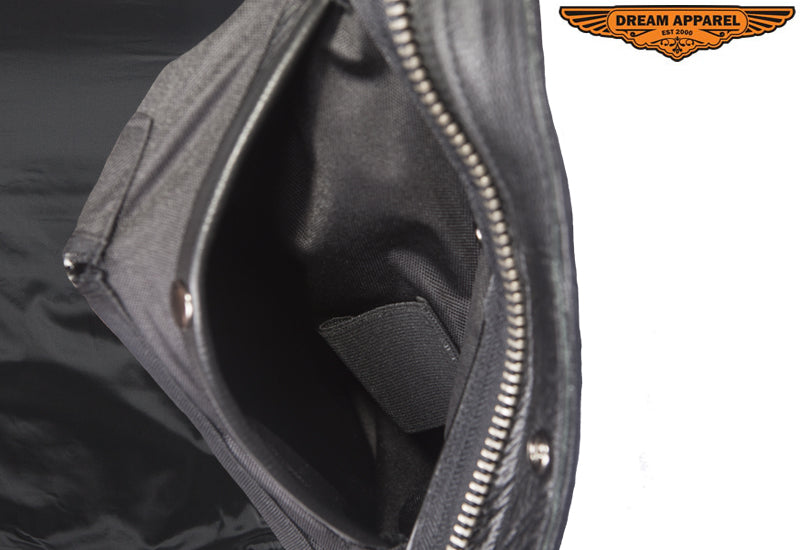 Dream Apparel understands the value of freedom, comfort, and personal protection. That's why we've made this genuine naked cowhide leather vest with two deep concealed gun pockets inside with button snaps, an inside slip pocket, and an inside zippered pocket. You're going to love the fit and feel of a premium cowhide leather club vest with a racing style collar, soft leather trim around the neck and arms, and a zippered front closure with button snaps. Make it truly your own by sewing any patches or embroidery onto the one-piece back panel. The two roomy slip pockets on the waist and two breast pockets with button-down flaps give you all the room you need for a days ride and will have you ready for whatever adventures await.