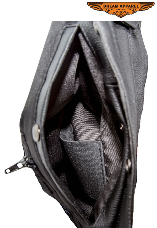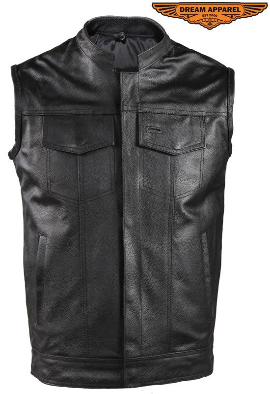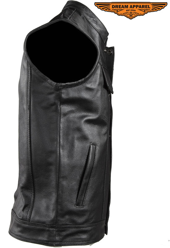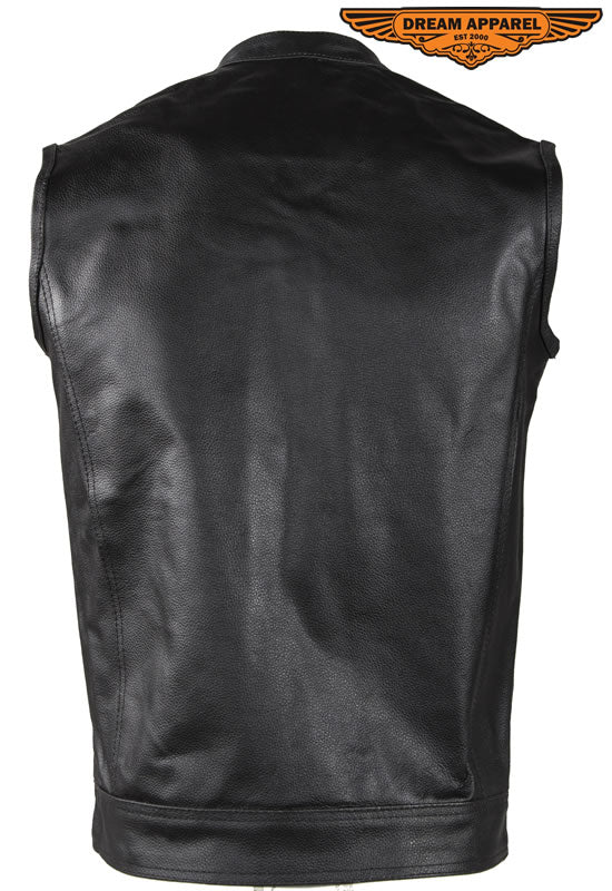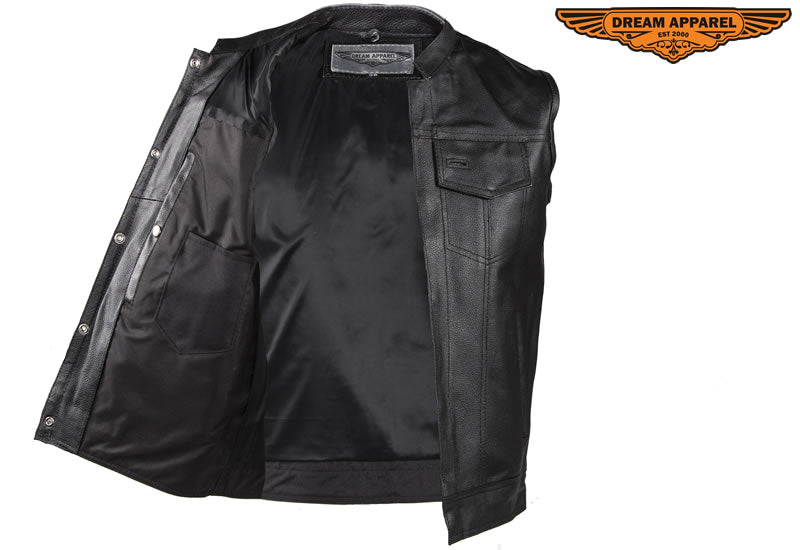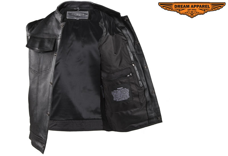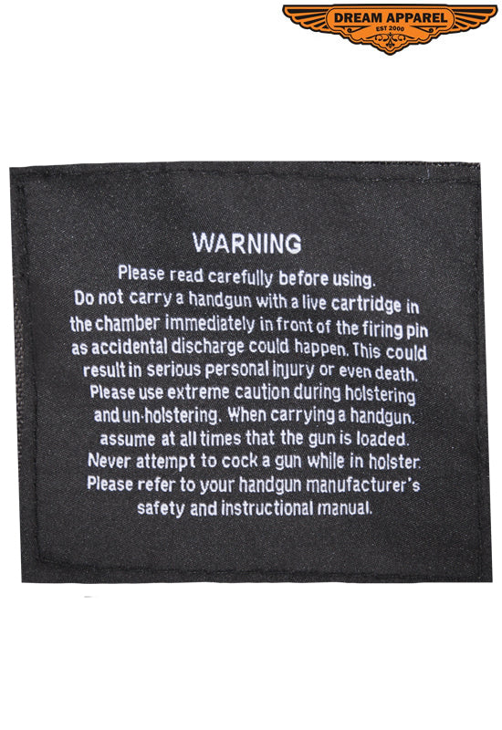 Let your free spirit run wild in our regular cowhide vest that respects the rights of gun owners with two deep concealed gun pockets inside with button snaps, an inside slip pocket, and an inside zippered pocket. The zippered front closure, leather trim around the neck and arms, and the race inspired collar are guaranteed to keep you comfortable on your very next trip.Two slip pockets on the waist and two breast pockets with button-down flaps provide even more room and the full back panel lets you proudly put on any sized patches making this vest a great value that makes your security a top priority without having to sacrifice style .