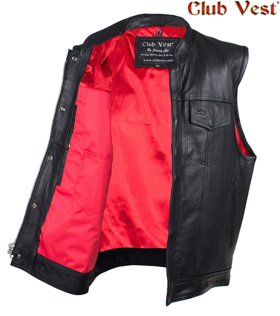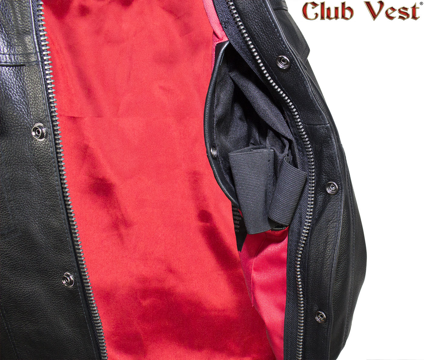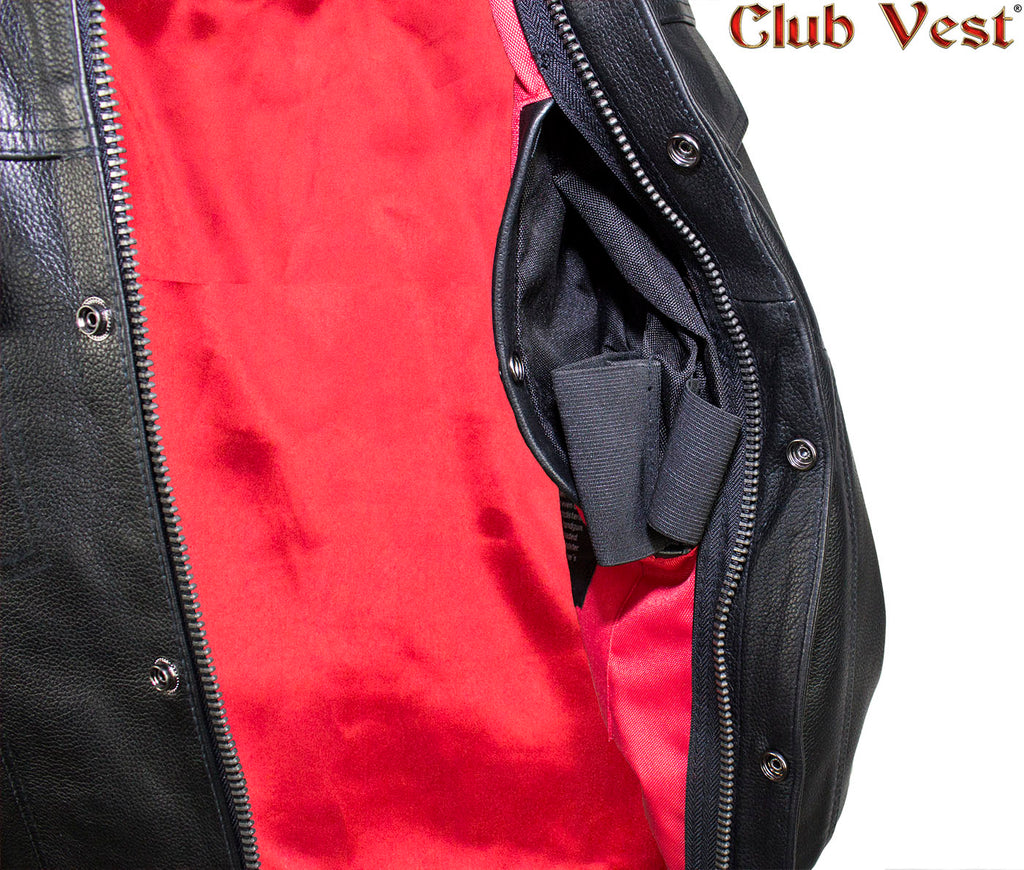 Club Vest's® concealed carry club vest is essential for any biker who wants to ride in the confidence that they're protected wherever they go. This vest is made from genuine naked cowhide leather and features two deep concealed gun pockets inside with elastic straps, one slip pocket on the inside right, and one zippered pocket on the inside left. Two roomy slip pockets on the waist and two breast pockets with button-snap closure, the left having a cut-out in the flap for sunglasses, complete the amazing amount of space you'll have for any need or emergency. Your comfort's assured with a race inspired collar, stylish pleating on the front and back, and the zippered closure with button-snaps. The full back panel that allows you to sew on your club patches and other embroidery complete this terrific vest. Order yours now as these incredible vests sell quickly.