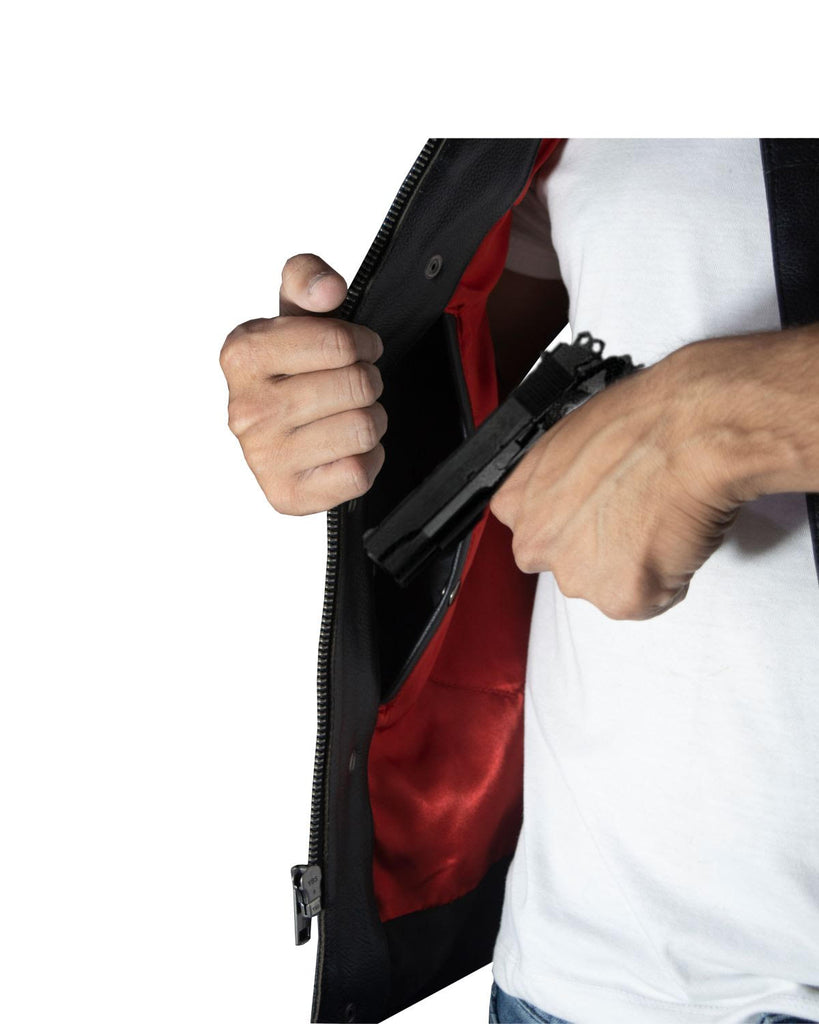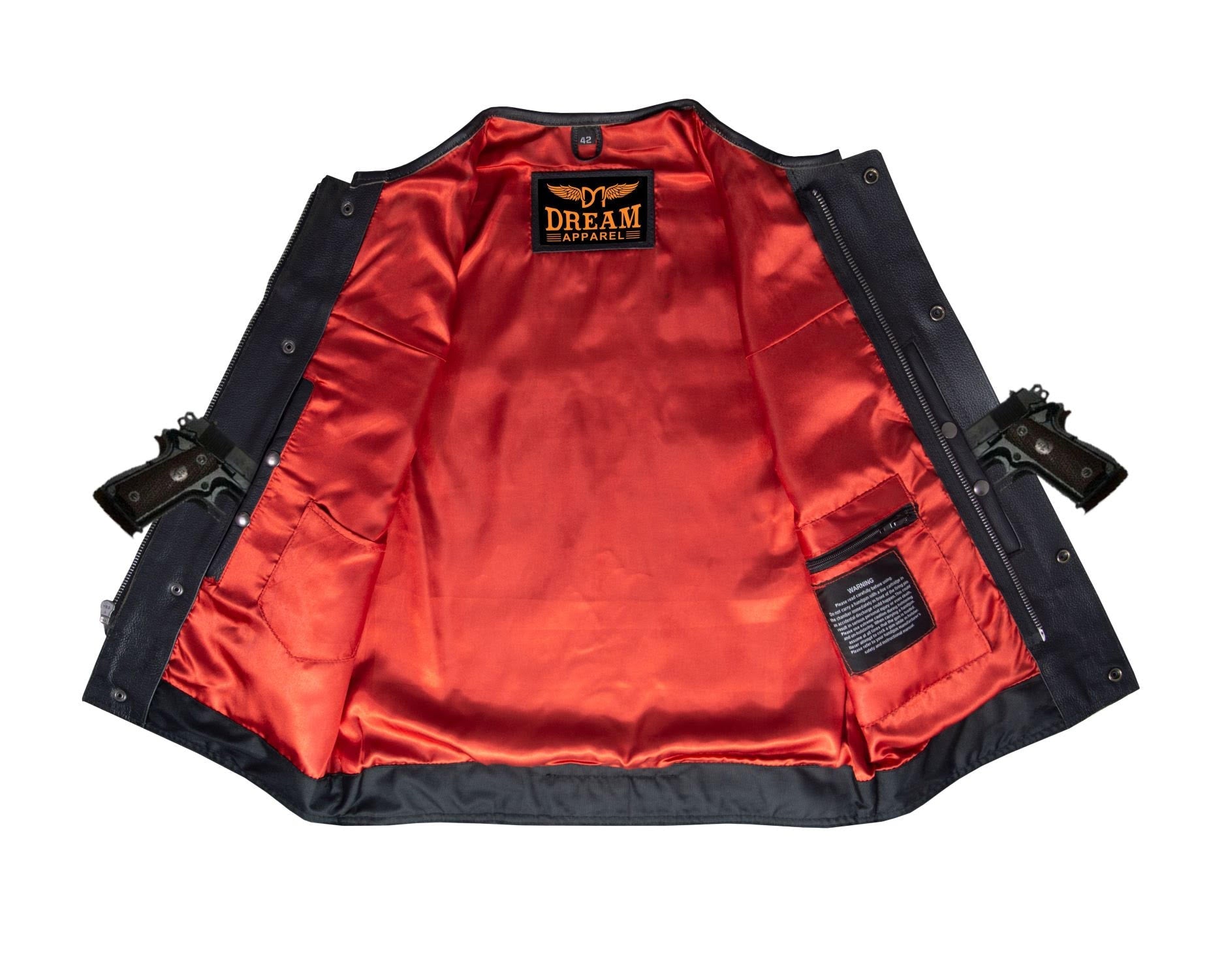 You don't just ride with any crew and you don't support any club, so don't just wear any ordinary vest folks. Dream Apparels Heavy Duty Cowhide Leather Vest is essential for any biker who wants to show off their attitude, this vest is made of high quality cowhide leather and features a solid back panel to show off numerous patches or club colors. With multiple front pockets to store items and front button snap closure you will have no problem throwing this vest on for the next important meeting. Also equipped with a stylish red polyester liner, 2 inside pockets and 2 large gun pockets with snap closure you can gear up right with confidence for any ride.