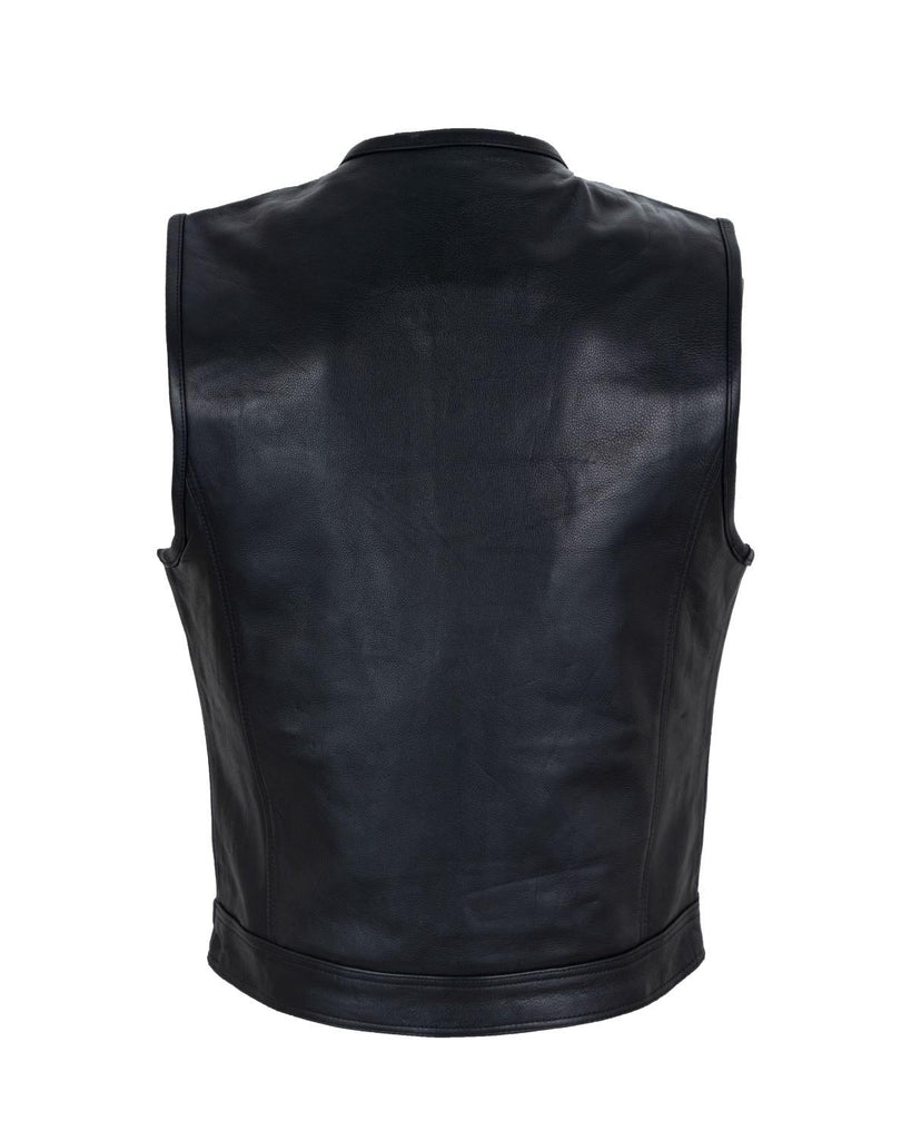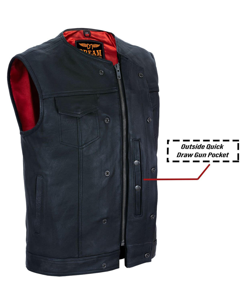 Mens No Collar Leather Motorcycle Club Vest with Red Liner Premium Cowhide Leather