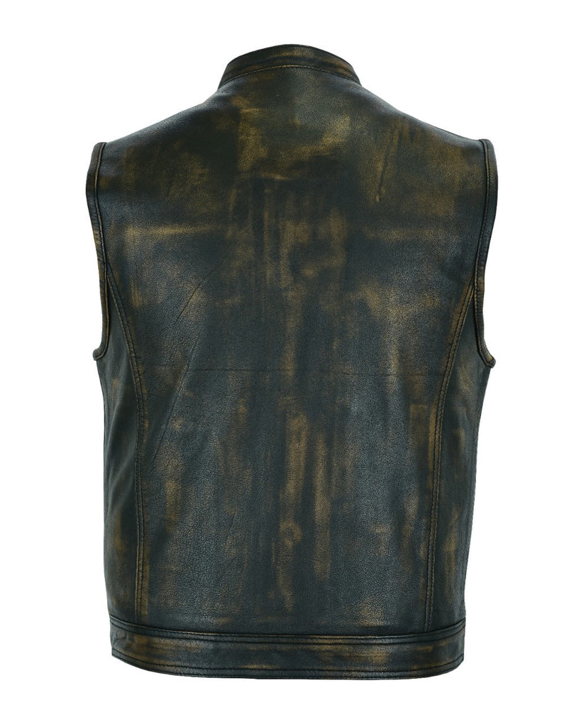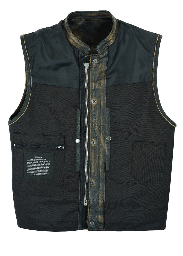 If you choose to carry a concealed handgun, then Dream Apparel's distressed brown naked leather vest with two deep concealed gun pockets inside with button snaps, an inside slip pocket, and an inside zippered pocket is definately something you should own. Made from premium cowhide leather with a racing inspired collar, soft leather trim around the neck and arms, and a zippered front closure with button snaps your comfort's assured as well as your safety. Make it your own and sew any patches or embroidery you have onto the clean back panel. Two slip pockets on the waist and two roomy breast pockets with button-down flaps provide more room on front for any personal items. This amazing vest sells out fast so make sure you order yours today. Order now as this incredible vest sells out quickly.