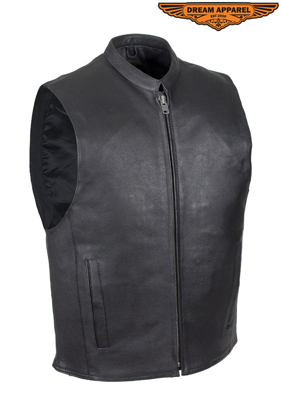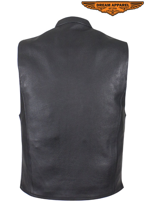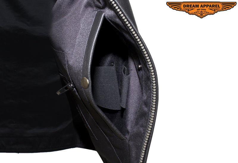 A motorcycle vest isn't just something you throw on because you need something to wear. After your bike, it's the second thing peoplenotice. Don't get caught in a cheap vest. Our fantastic Motorcycle Club vest is made of premium cowhide leather and features two deep concealed gun pockets inside with elastic straps to secure the barrel, one slip pocket on the inside right, one zippered pocket on the inside left, and two roomy button-snap pockets on the waist so you're ready for whatever the world throws at you. We've included a race inspired collar, a black soft nylon liner, stylish pleating on the front and back, and a button-snap front closure so you look as good as you feel. Once you put your patches and embroidery on the full back panel, you'll wonder why you ever wore anything else.