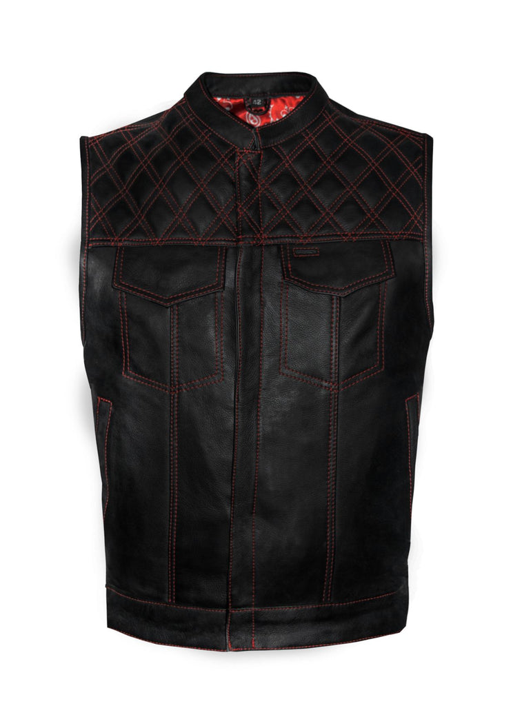 Mens Leather Club Vest Red Thread, Red Paisley Lining, Zipper Front, Diamond Padding
