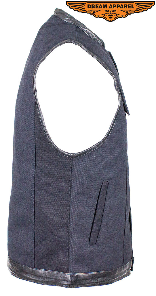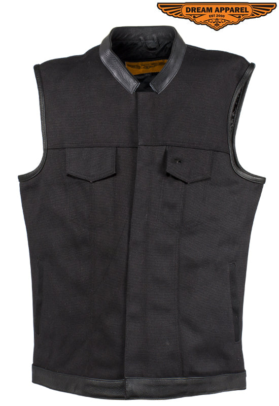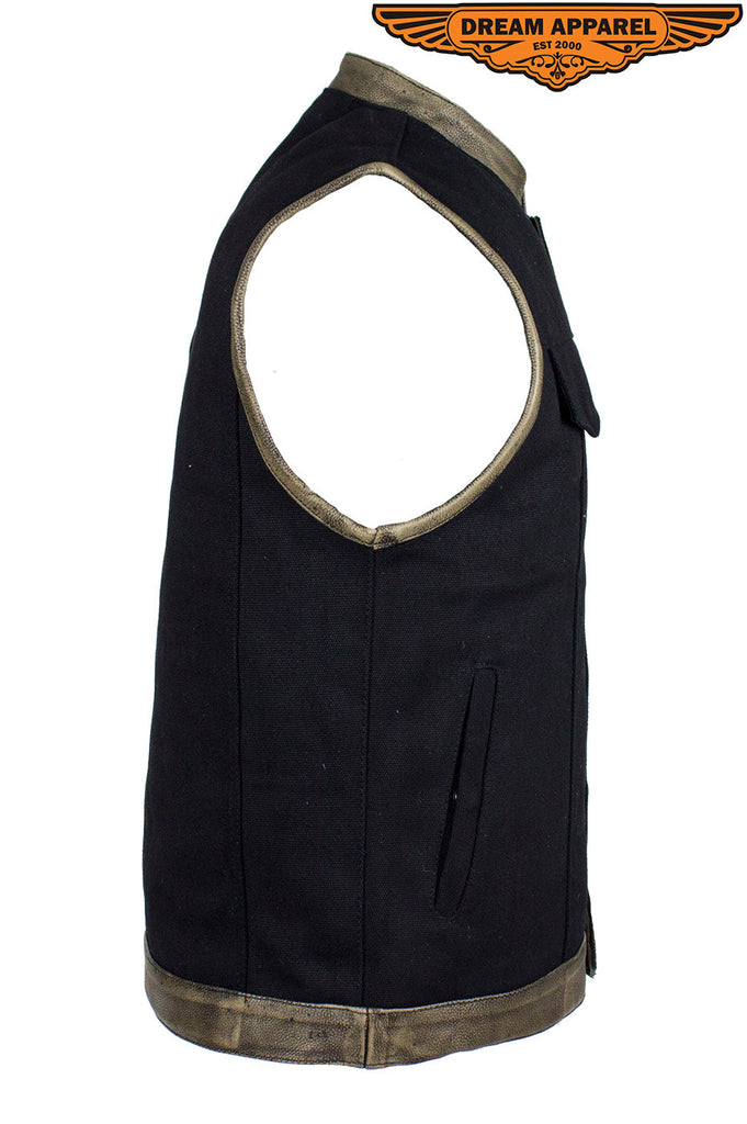 Black Canvas Motorcycle Vest with Distressed Brown Leather Trim