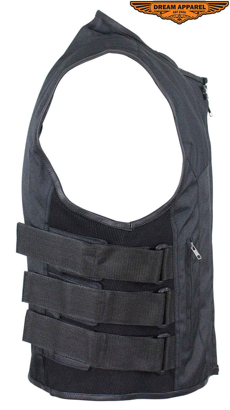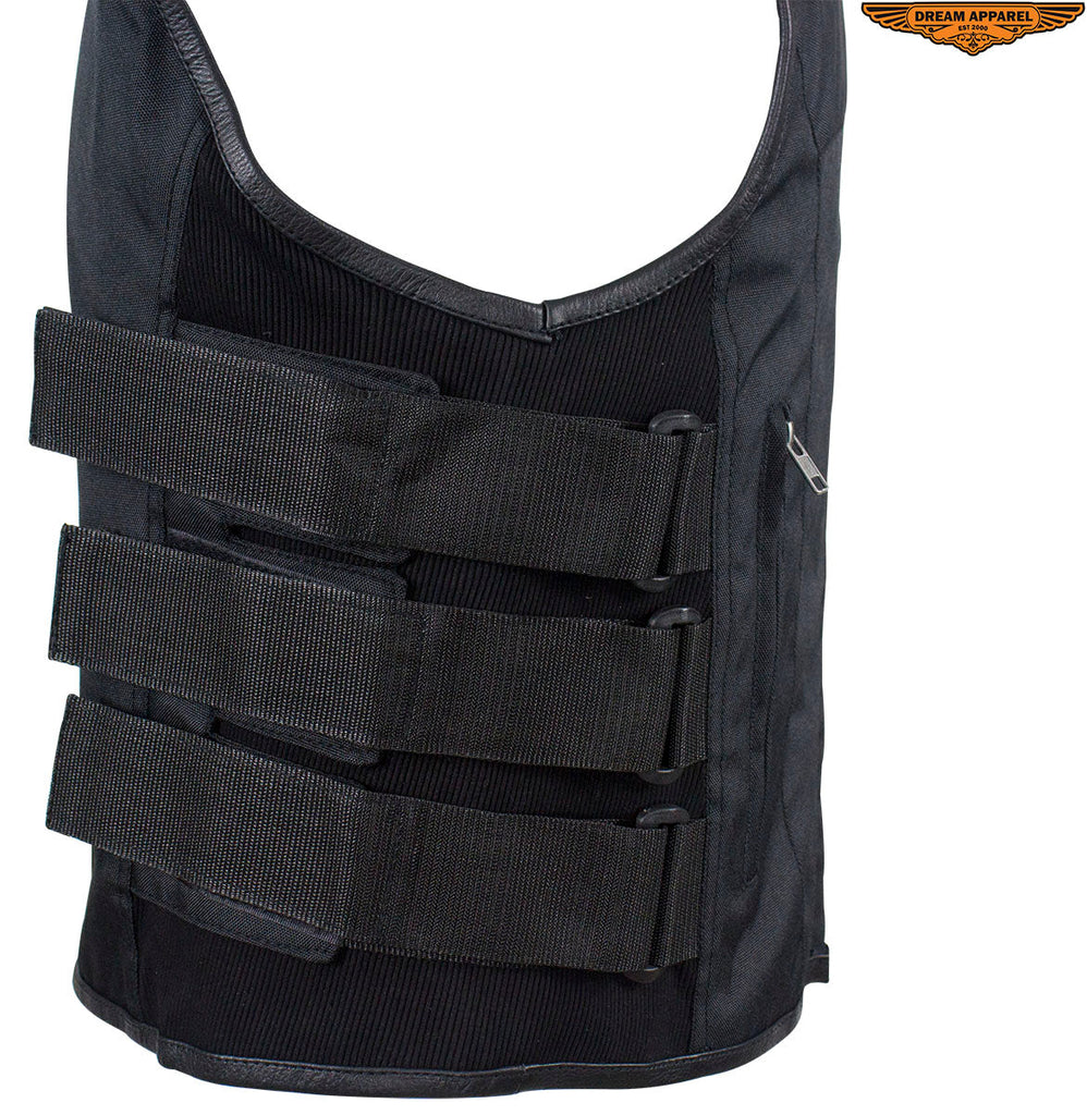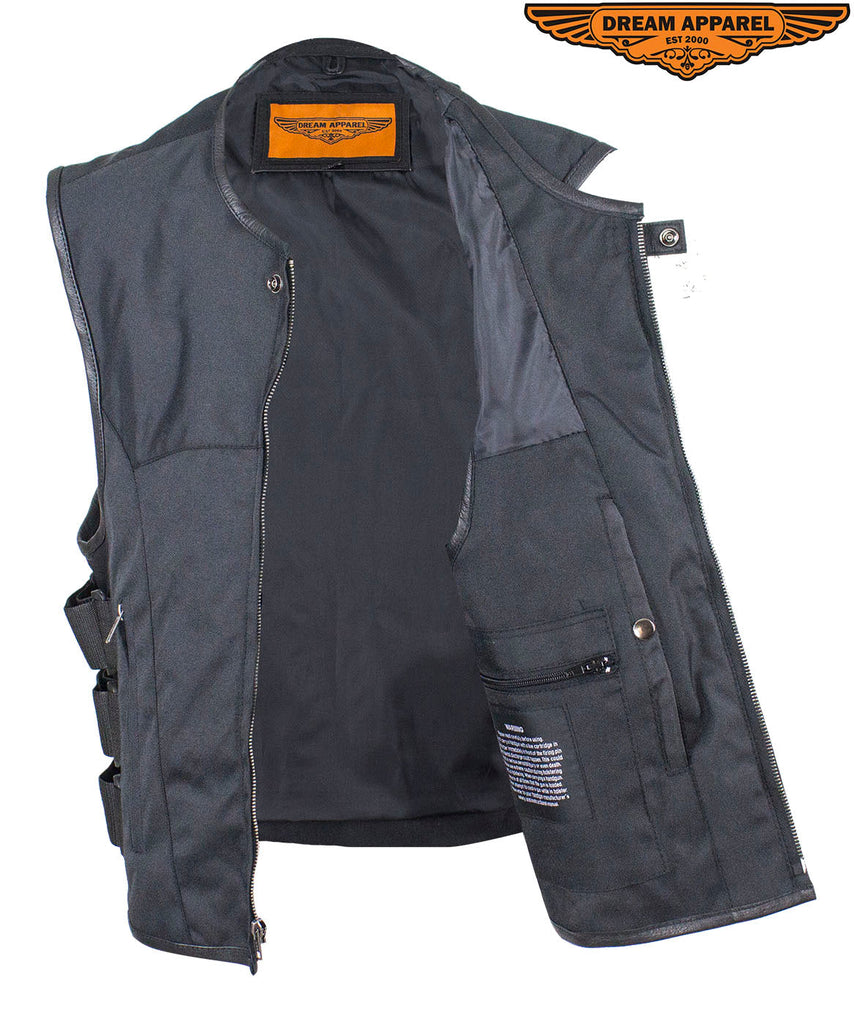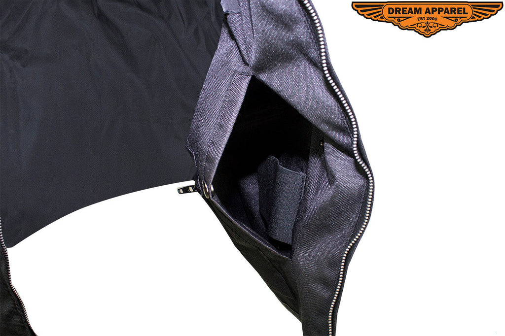 You’re not the type that rides unarmed and Dream Apparel understands. That’s why we’ve made this incredible black textile vest that features two deep concealed gun pockets inside with button snaps and elastic straps, an inside slip pocket, a large interior zippered pocket, and three large adjustable straps on either side you can adjust for comfort. You’ll love how the front zips right up to the single leather buttoned strap at the neck and the two inverted zippered pockets on the waist that let you carry everything else you might need for the ride. Once you transfer your own patches onto the full back panel you’ll wonder how you ever rode without a vest like this.