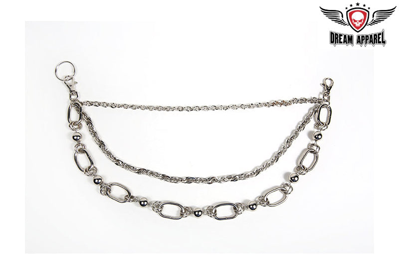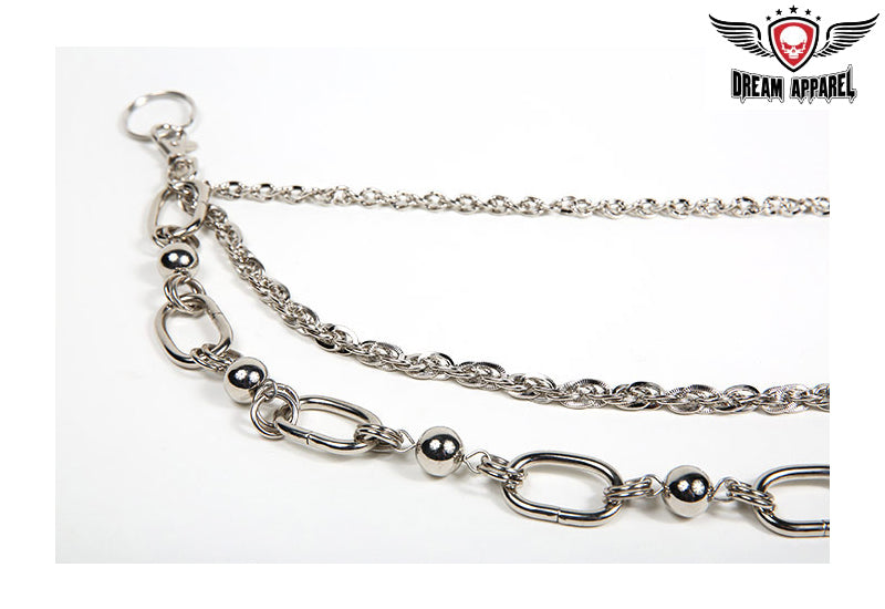 Some motorcycle riders have every extra accessory possible on their hog, so if you're the biker with a tricked out chopper then our multi Biker Chain is for you. This Biker Chain has 3 stylish chrome steel chains; first is classic twisted steel loops, second longest chain is multiple woven steel loops with etched details, the large third chain has 8 chain links connected by multiple steel rings and balls. This chain has lobsters clasps on each end for easy attachment to belt, pants, chaps, vest, jacket, boots or whatever else you want tricked out.