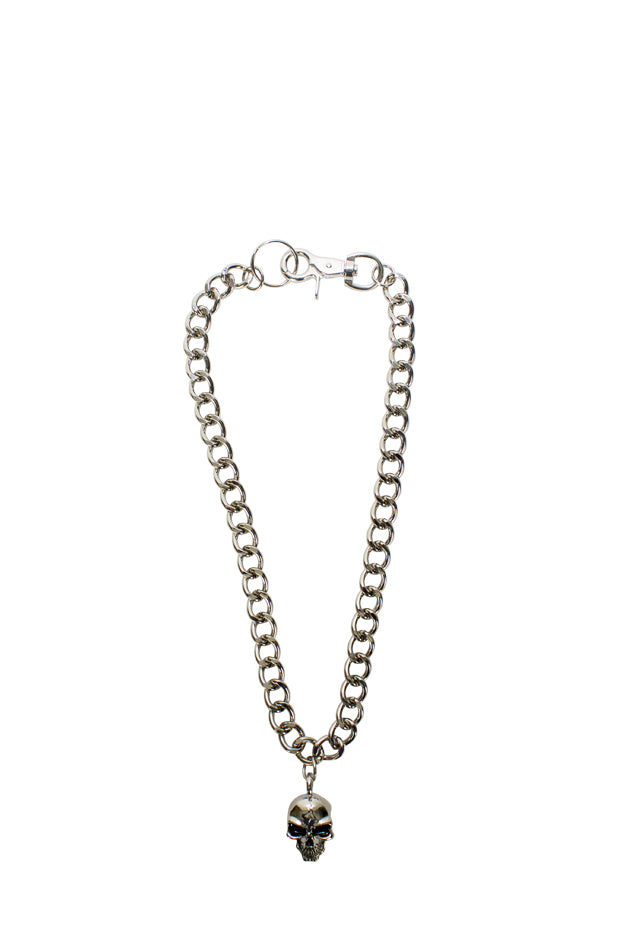 A classic look with an added twist. The chrome loops give it a familiarity in the biker world while the skull placed in the center makes it all the more appealing. The 25" inch long length makes this chain perfect for just about any biker. A lobster clasp to make the attachment and detachment process easier. Beautifully designed skull will be sure to stand out in any scenario. All in all this chain is any bikers dream come true.