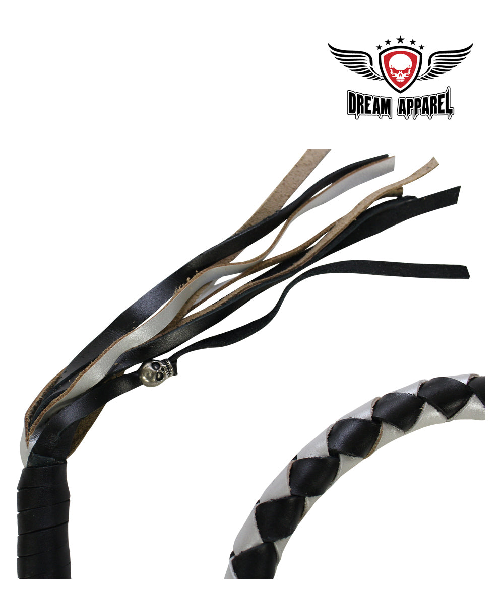 Our beautiful black and silver get back whips are back, this time newly made at a smaller yet very durable design perfect to give your motorcycle a terrific classic outlaw biker look. We give you 36" of genuine black and silver hand-braided naked cowhide leather tied to a strong stainless steel quick-release clip. The ends are finished with tightly wrapped black leather and black and silver threaded fringe with a fine silver skull tied to one of the fringes. Our whips hand straight from the handlebars while idle and move freely on the wind while moving, unlike a cheap